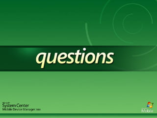 The document discusses how to secure and manage Windows Mobile devices within an enterprise environment using System Center Mobile Device Manager. It provides an overview of key capabilities like deploying devices through Active Directory, enforcing over 130 security policies, remotely wiping devices, and distributing software updates through Windows Server Update Services. The solution addresses concerns around preventing unauthorized use, disabling device features, controlling access to services, and encrypting stored data. It also describes the process for initially enrolling and configuring devices through an activation wizard and one-time PIN.
