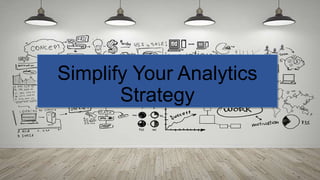 This document provides tips for simplifying an analytics strategy. It recommends accelerating data by creating a hybrid data platform. It also suggests delegating work to analytics technologies like interactive BI tools. Additionally, it advises using data discovery techniques to uncover patterns and find opportunities. Industry-specific applications and machine learning can also simplify advanced analytics. Developing an data-driven culture and talent is important for ensuring an effective analytics strategy.