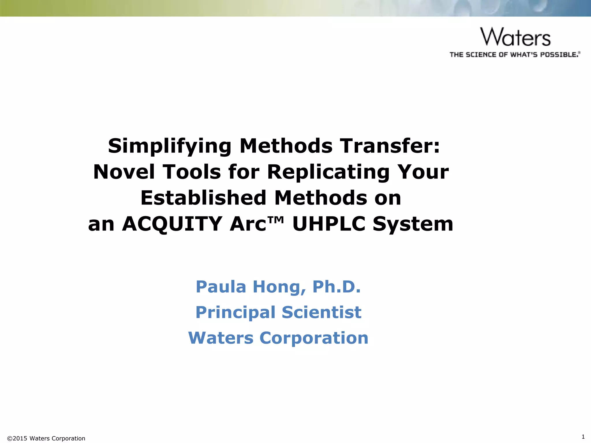 The document discusses the challenges and strategies for method transfer to modern liquid chromatography (LC) systems, specifically focusing on the Acquity Arc system which bridges the gap between HPLC and UPLC technologies. It emphasizes the importance of matching system characteristics like dwell volume, mixing behavior, and gradient profiles to ensure successful method transfers while maintaining regulatory compliance. The text outlines various strategies, including using hardware emulation tools and making necessary adjustments to optimize retention times during method transfers.
