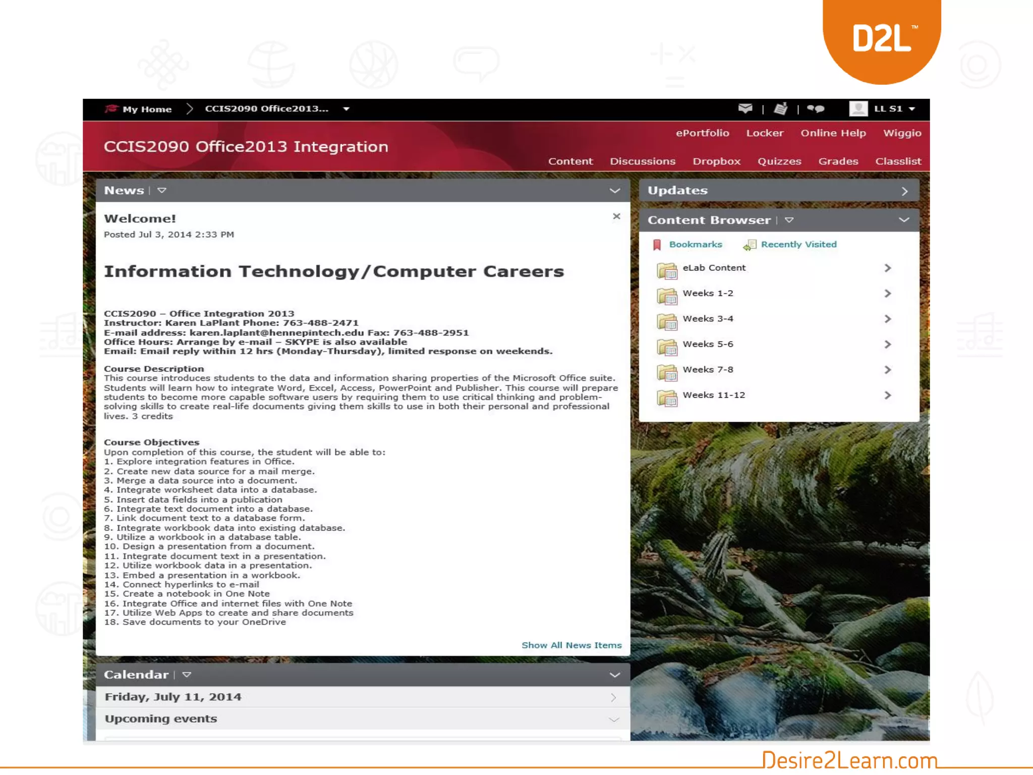 The document discusses the integration of publisher content into courses using Labyrinth Learning's LTI 1.1 application, enhancing automation in grading and accessibility through the D2L interface. It highlights the benefits of LTI, such as seamless access to learning tools, single sign-on, and gradebook synchronization, which facilitate a more engaging course experience for students and instructors. The integration of the Elab platform provides a comprehensive set of resources for assessments and interactive learning, streamlining the educational process within traditional LMS frameworks.