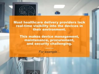 The document discusses how healthcare providers often lack visibility into their medical devices, making it difficult to effectively manage device inventory, maintenance, procurement, and security. It outlines challenges such as relying on outdated manual inventories, not knowing when to schedule maintenance based on actual usage, struggling to identify devices needing patches, and not having full visibility into inventory for procurement needs. The document promotes a medical device security platform that provides real-time visibility into devices through IoT/IoMT inventory and status tracking, granular device profiles containing attributes, and insights into device usage, risk status, and activity to help simplify lifecycle management.