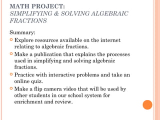 This document outlines a math project on simplifying and solving algebraic fractions. Students will explore resources on algebraic fractions, create a publication explaining how to simplify and solve them, and make a video demonstrating problems. The project addresses standards on rational exponents, operating with algebraic expressions, and using rational equations to model and solve problems. Students will learn to add, subtract, multiply and divide algebraic fractions and solve rational equations.