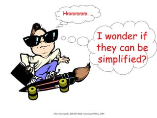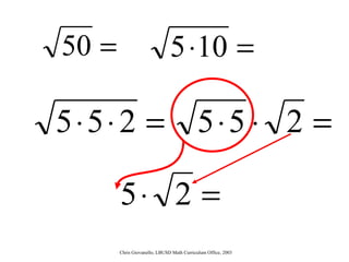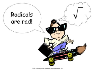 The document provides instructions for students on how to simplify radicals. It defines what it means to simplify a radical as having no perfect square factors in the radicand. The objective is for students to be able to simplify at least 9 out of 10 radicals correctly. Students are taught to rewrite the radicand using prime factorization, replace any perfect square factors with their numeric equivalent, and check if the radicand is simplified by having no remaining perfect square factors. Examples are worked through and students complete guided practice problems to demonstrate their understanding.