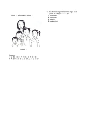 Dokumen ini mengandungi soalan pemilihan jawapan mengenai simpulan bahasa yang berkaitan dengan pelbagai situasi. Setiap soalan disertakan dengan pilihan jawapan yang perlu dipilih untuk melengkapi ayat yang disediakan. Terdapat 15 soalan yang mencakupi pelbagai situasi sosial dan interaksi.