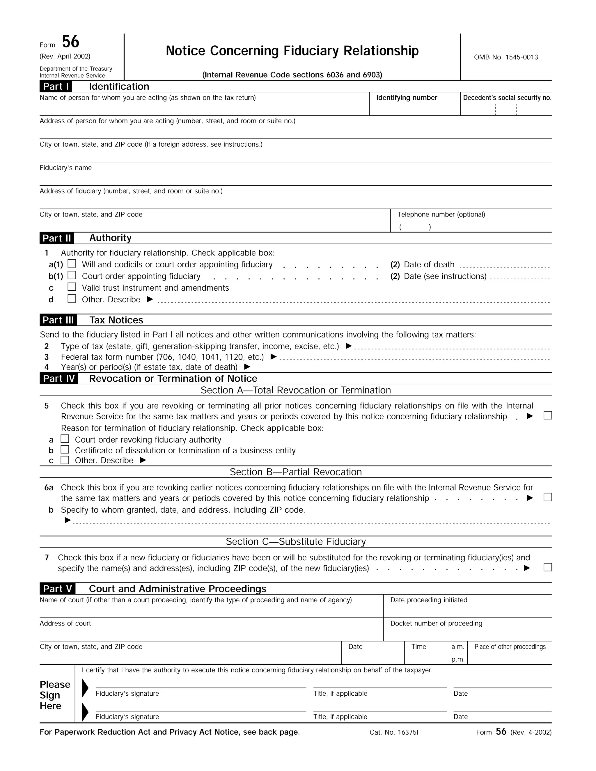 This document is an IRS Form 56 for notifying the IRS of a fiduciary relationship. It provides instructions for completing the form. The form has five parts: Part I requests identification information for the person and fiduciary; Part II requires the fiduciary to specify the authority under which they are acting; Part III allows the fiduciary to request tax notices; Part IV covers revoking a prior notice; and Part V is for court proceedings information. The summary provides an overview of the purpose and contents of the IRS form and instructions.