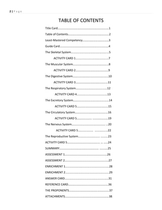 This document provides information about the major body systems, including the skeletal, muscular, digestive, respiratory, excretory, circulatory, nervous, and reproductive systems. It includes diagrams and descriptions of the parts of each system and how they work together. Activities are included after each section to help students assess their understanding of the key concepts about how the body's systems function.