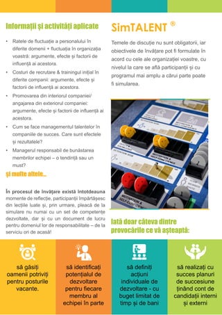 Simtalent® este un program de management al talentelor care permite participanților să devină manageri, învățând cum deciziile lor afectează dezvoltarea potențialului angajaților într-un cadru de simulare. Participanții se confruntă cu provocări reale, inclusiv gestionarea bugetelor limitate și promovarea din interiorul organizației, în timp ce dezvoltă competențe relevante pentru managementul talentelor. Obiectivele de învățare sunt personalizabile, iar programul oferă un set de instrumente concrete pentru implementarea strategiilor de dezvoltare a echipei.