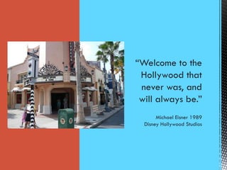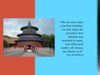 This document discusses Jean Baudrillard's theory of simulacra and simulation as it relates to media and cultural representations. Baudrillard described how representations become increasingly distant from reality, moving from serious representations, to distorted media versions, to idealized simulations that seem more real than reality. As an example, he cites Disney World, which creates a hyperreal world of representations without originals. However, the document notes that Baudrillard used provocative examples and language. Other theorists like Bruno Latour argued that reality is simultaneously real, narrated through discourse, and collective through social relations and cultural models.