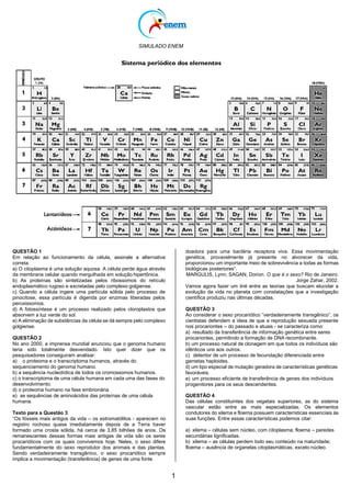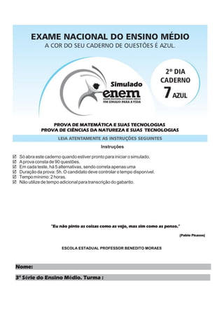 This document provides instructions for a simulated exam. It states that the exam consists of 90 multiple choice questions to be completed within 5 hours. It notes the minimum time of 2 hours and instructs students not to use extra time to transcribe answers. It provides the student's name and class information. The exam will cover mathematics, natural sciences, and their technologies.