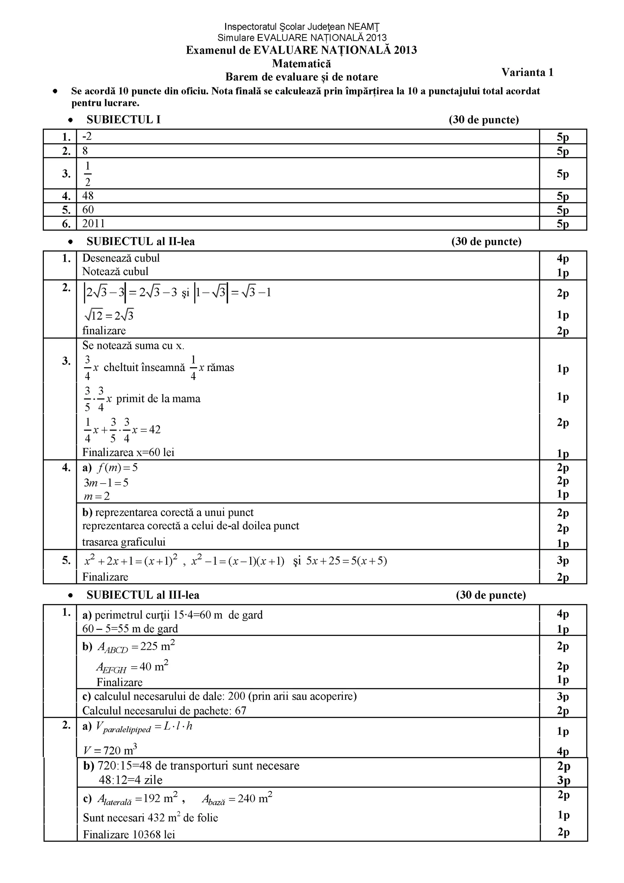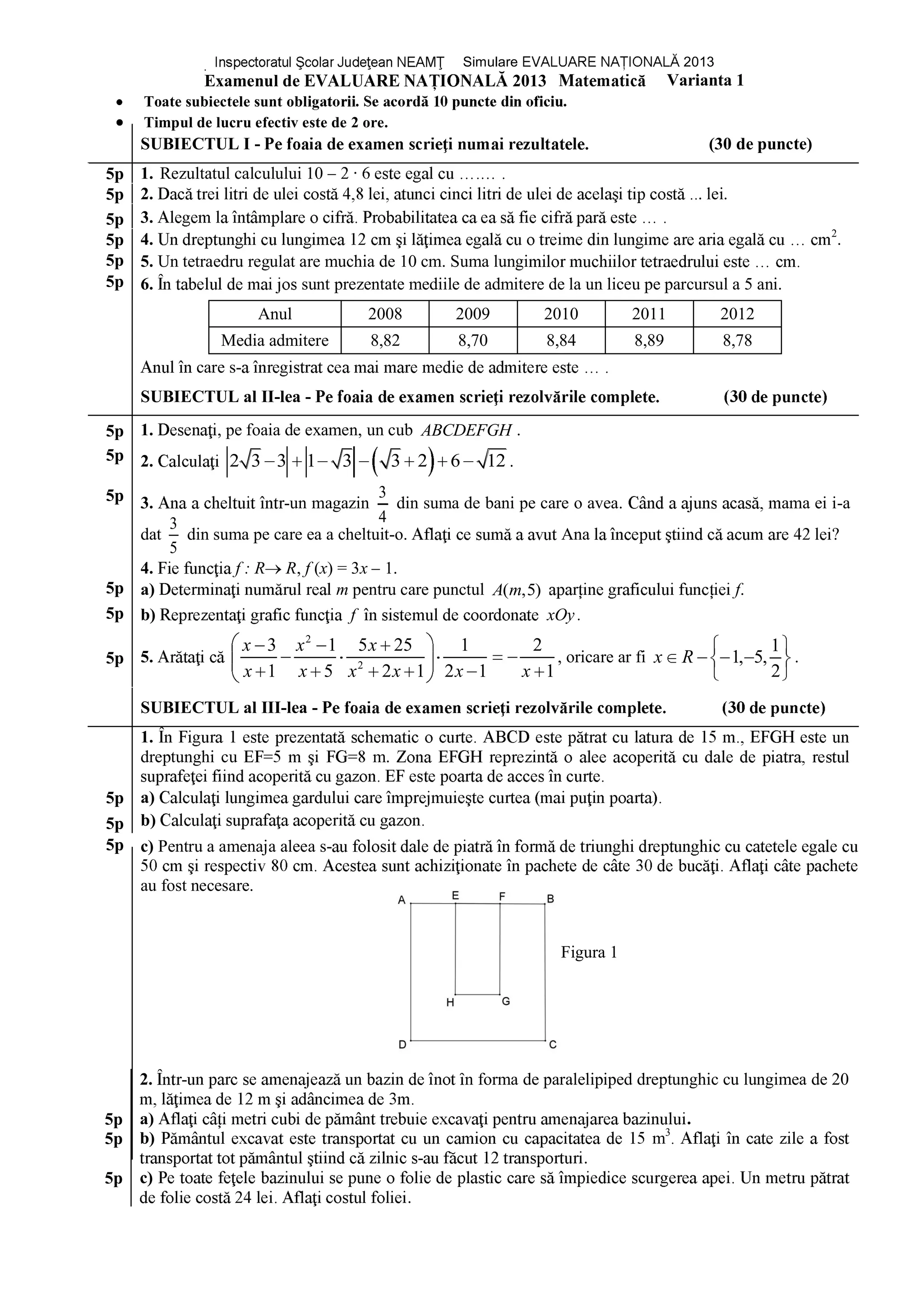 Documentul conține întrebările și structura examenului de simulare din 2013, care include mai multe subiecte cu punctaje corespunzătoare. Subiectele acoperă teme de geometrie, medii de admitere și funcții matematice. Timpul de lucru efectiv pentru examen este de 2 ore.
