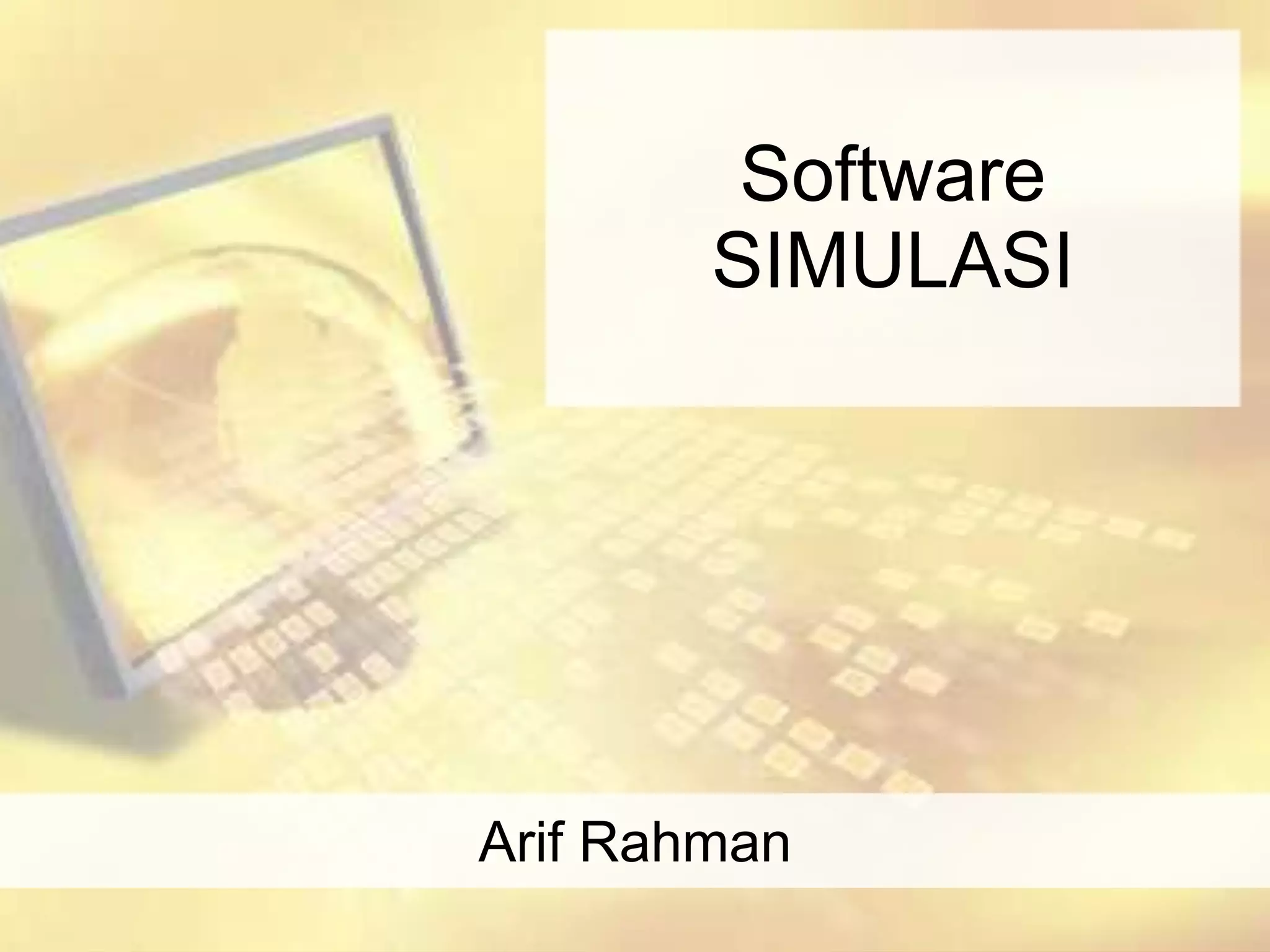 Dokumen ini menjelaskan langkah-langkah dalam memilih software simulasi, termasuk analisis sistem dan keputusan. Kriteria pemilihan software meliputi fitur umum, kapabilitas statistik, layanan pengguna, dan laporan output. Berbagai jenis software simulasi dan pertanyaan yang perlu dipertimbangkan saat pemilihan juga diuraikan.