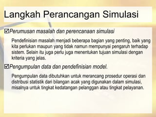 Ringkasan dokumen tersebut adalah: (1) Dokumen tersebut membahas langkah-langkah perancangan simulasi mulai dari perumusan masalah, pengumpulan data, pendefinisian model, verifikasi program komputer, percobaan awal, desain eksperimen, hingga analisis hasil dan dokumentasi; (2) Langkah-langkah tersebut dilakukan secara berulang untuk memvalidasi model simulasi; (3) Dokumen tersebut juga membah
