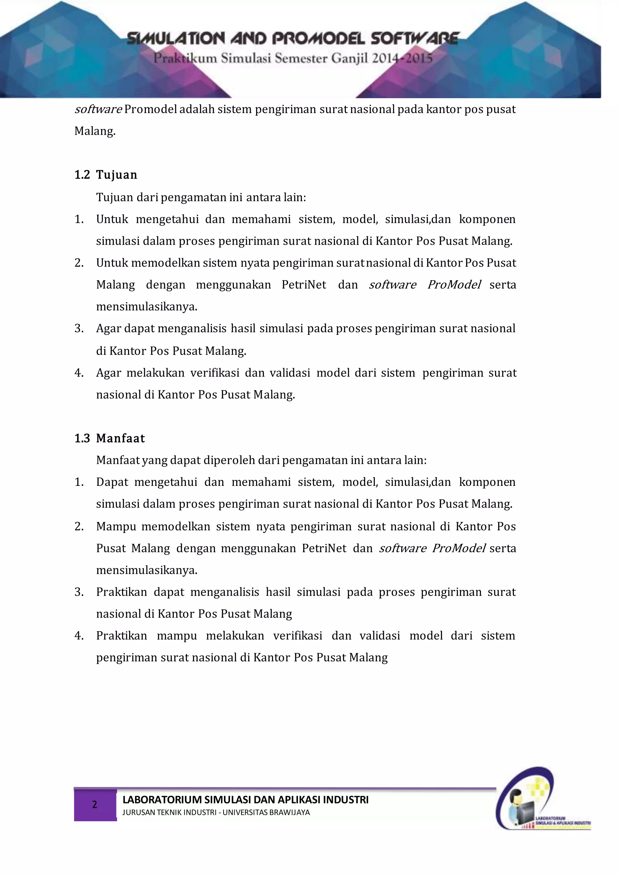 Dokumen tersebut membahas tentang laboratorium simulasi dan aplikasi industri pada jurusan teknik industri di Universitas Brawijaya. Dokumen ini menjelaskan tentang sistem pengiriman surat nasional di Kantor Pos Pusat Malang yang akan dimodelkan menggunakan perangkat lunak simulasi.