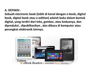 Dokumen ini menjelaskan tentang pembuatan e-book yang merupakan buku digital yang memudahkan pembaca dan penulis. Penjelasan mencakup pemilihan format e-book, dengan rekomendasi penggunaan format EPUB, serta aplikasi yang diperlukan untuk menyusun dan membaca e-book di berbagai perangkat. Di akhir, dokumen memberikan tujuan pembelajaran bagi siswa tentang e-book dan perangkat terkait.