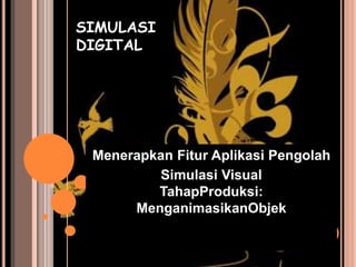 Tim penyusun kelompok 6 menjelaskan proses animasi perpindahan lokasi objek dalam simulasi visual dengan menggunakan aplikasi pengolah animasi. Proses animasi meliputi pengaturan frame, penentuan tahapan gerak, merekam perubahan lokasi objek pada frame tertentu menggunakan keyframe. Contohnya adalah animasi gerak naik turun tulang pusat penggerak model kopling manual.