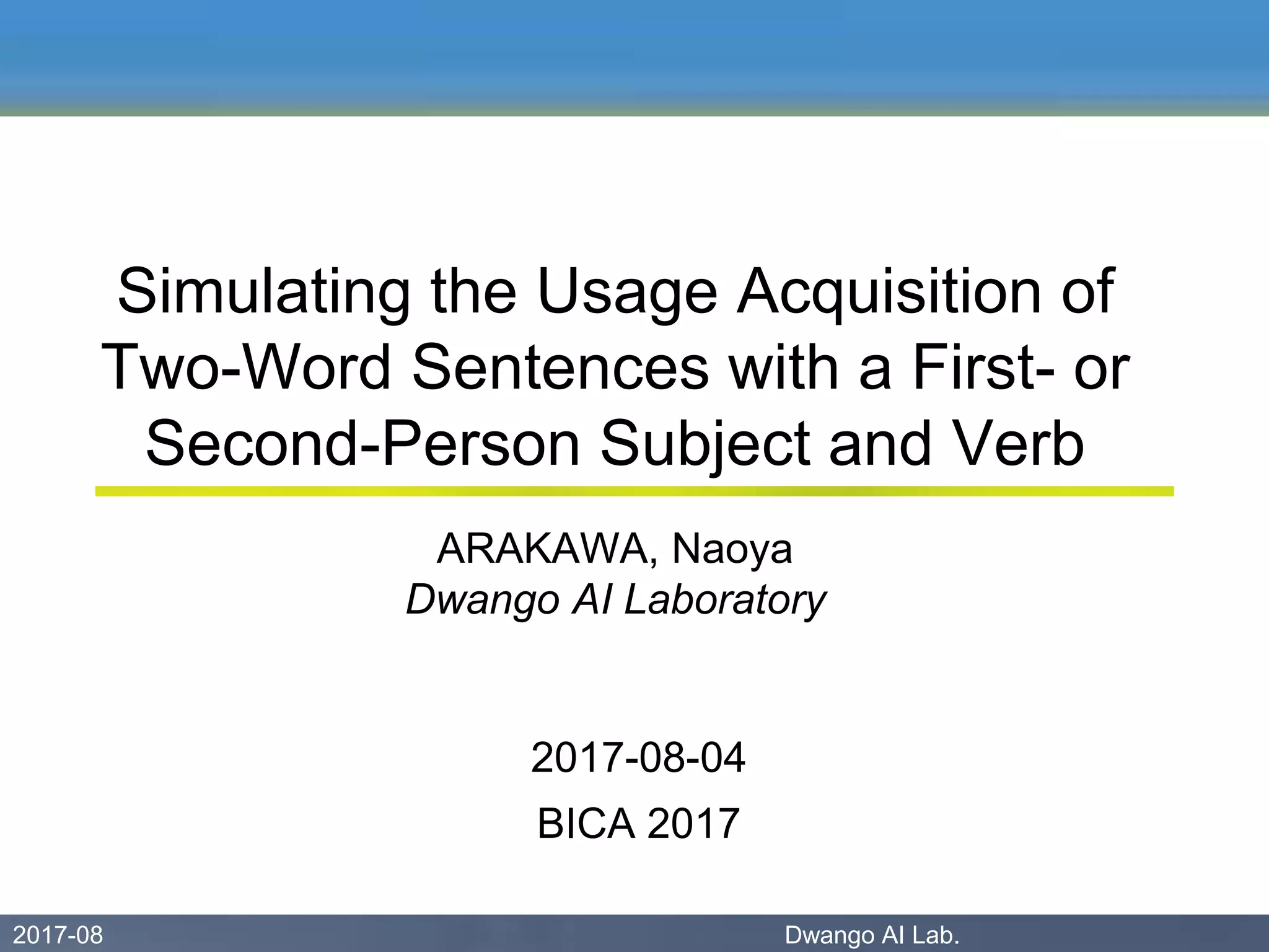 The document discusses an experiment conducted by the Dwango AI Laboratory to simulate language acquisition, specifically the learning of first and second-person pronouns in two-word sentences by a simplified agent interacting with a caretaker. Results showed that the learner could achieve a 90% correctness rate in uttering and acting after 1,200 interactions, indicating that language can be learned from a single caretaker without grounded concepts. The findings highlight the role of rewards, babbling, and various modes of action in the language learning process.
