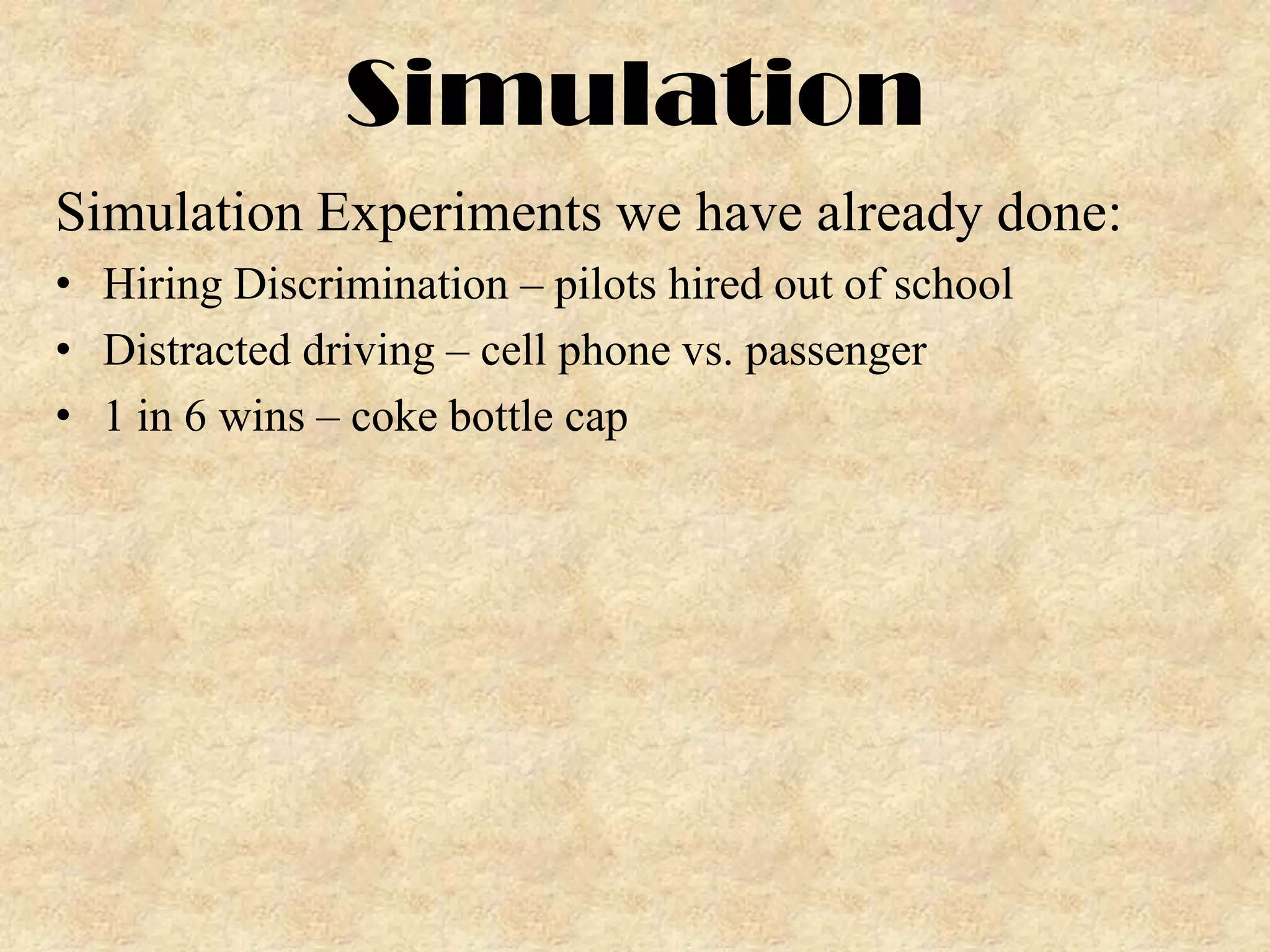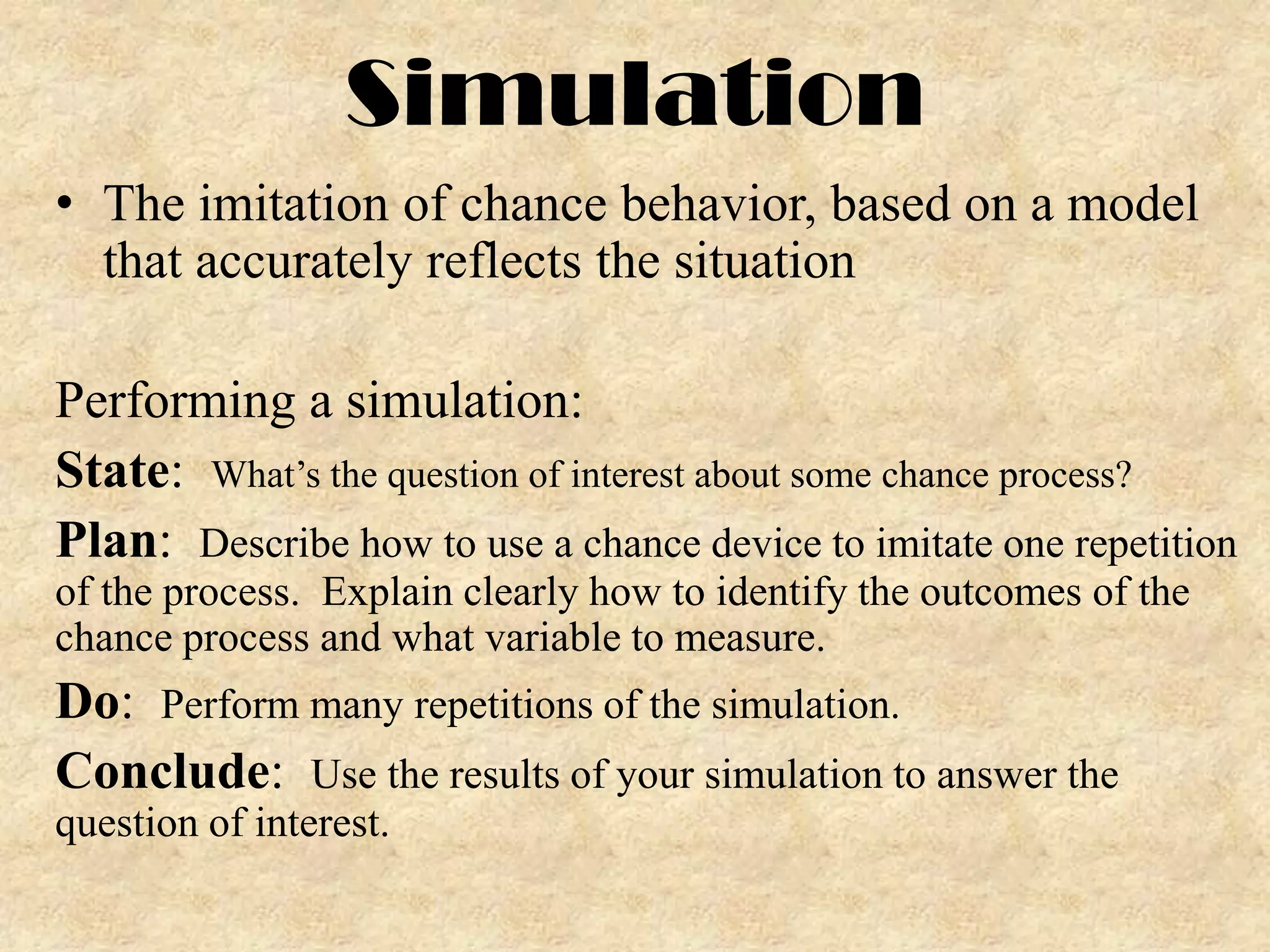 The document discusses simulations and provides examples. It describes simulating a parking lottery at a high school to determine if it was plausibly fair after two students from the same statistics class won spots. It outlines planning the simulation by numbering all 95 eligible students, those in statistics 1-28 and others 29-95, then randomly selecting two numbers using a random number table to simulate drawing winning tickets. The document also discusses simulating collecting NASCAR trading cards from cereal boxes to determine if a fan should be surprised it took 23 boxes to collect all 5 cards.