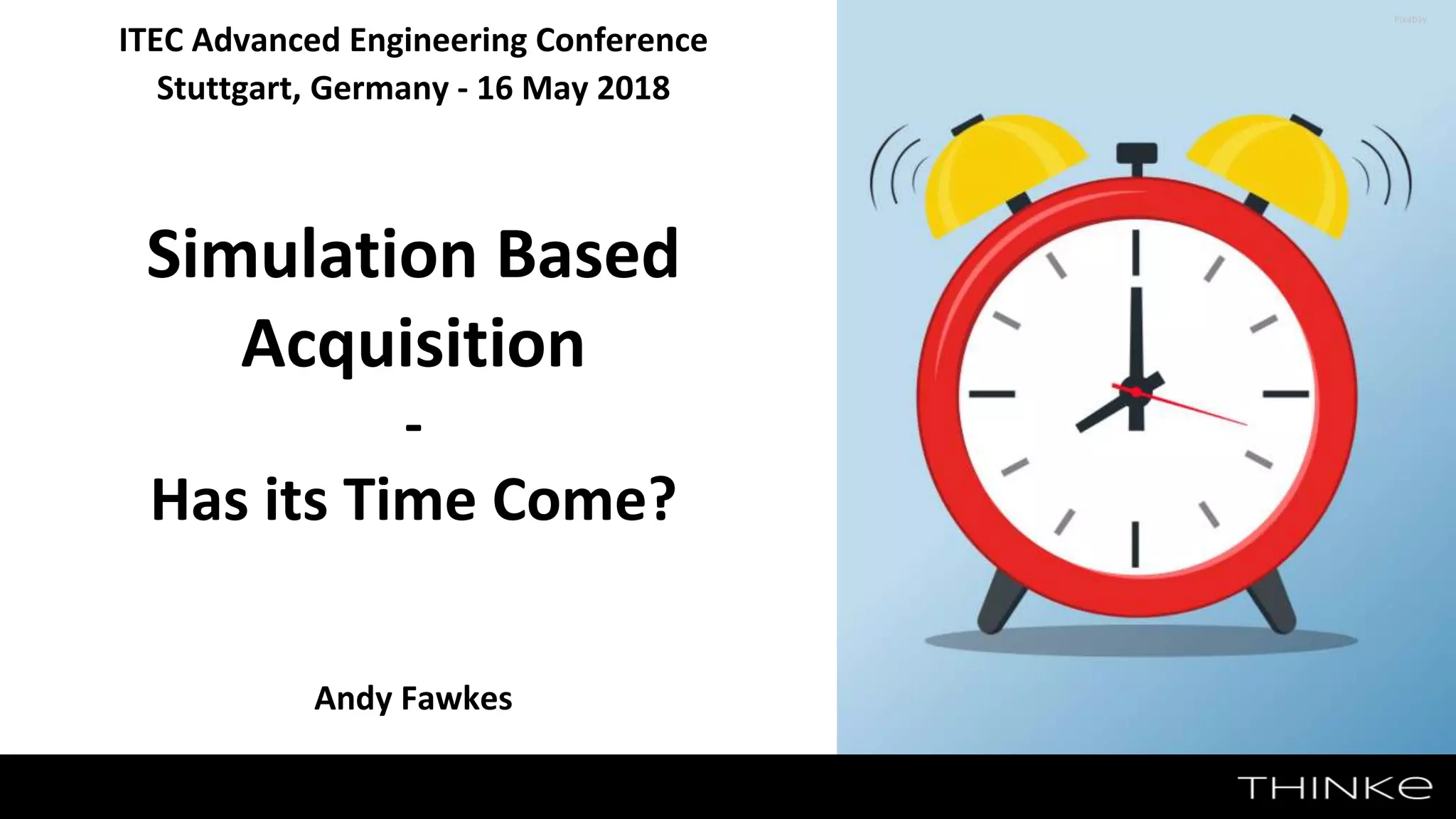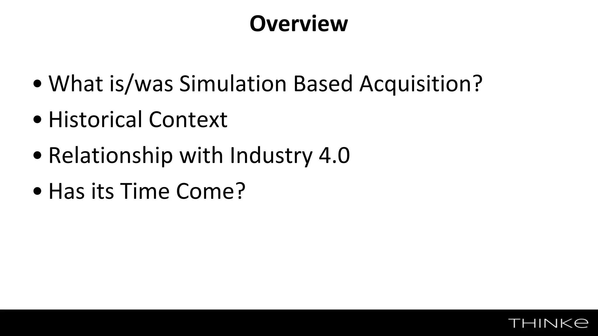 The document discusses the concept of simulation-based acquisition (SBA) in defense and industry, highlighting its vision, historical context, and challenges faced in implementation. It emphasizes the importance of modeling and simulation technology for improving acquisition processes and achieving efficiency in costs and timelines. Ultimately, the document questions the current relevance of SBA in the context of Industry 4.0, suggesting both potential and obstacles in fully realizing its goals.