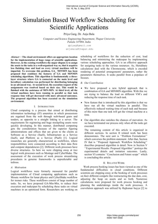 The document presents a new hybrid algorithm, GA-MinMin, designed for efficient scheduling of scientific workflows in cloud computing environments. This approach aims to optimize execution time and load balancing across virtual machines by running them in parallel and integrating genetic algorithm features with MinMin scheduling. Experimental results demonstrate the algorithm's effectiveness on complex scientific applications like Montage and Cybershake, achieving significant reductions in response times and execution times.