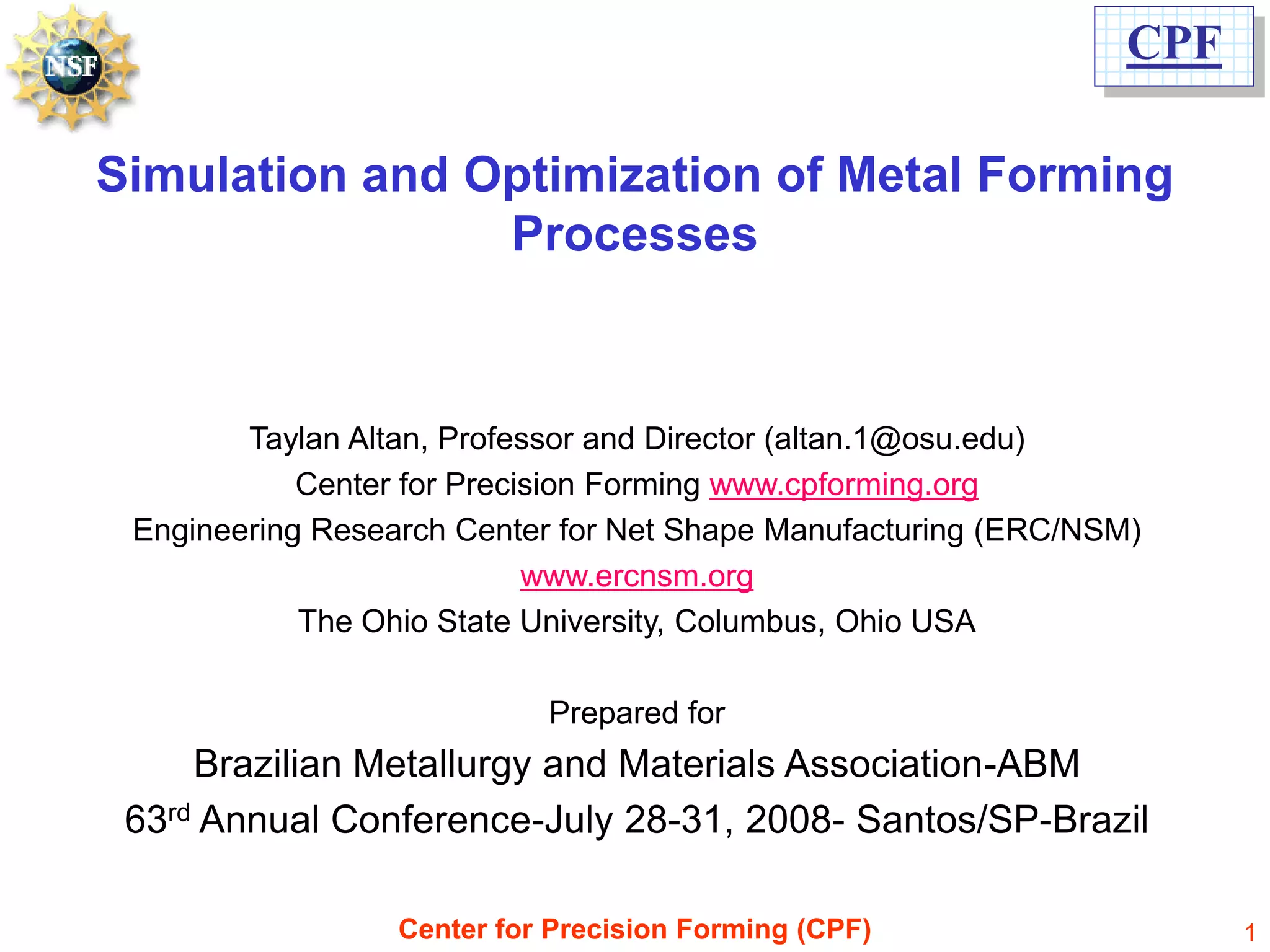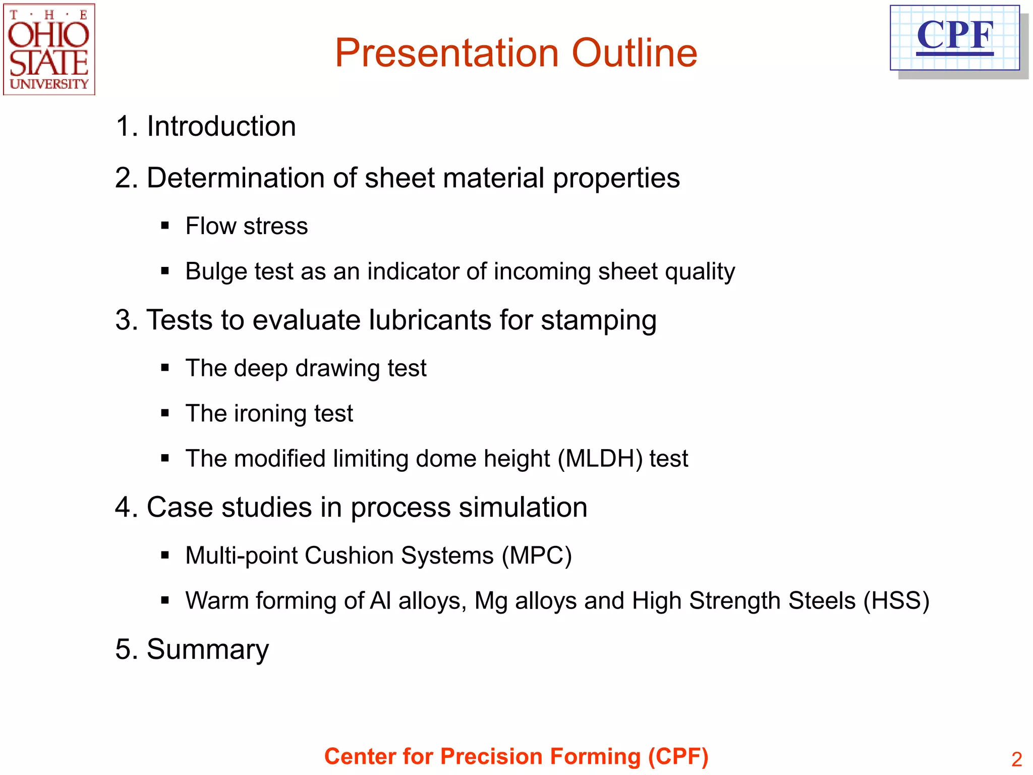 The document discusses simulation and optimization of metal forming processes. It describes the Center for Precision Forming (CPF) and its work determining sheet material properties through bulge testing, evaluating stamping lubricants using tests like deep drawing, and simulating processes like multi-point cushion systems. CPF uses finite element analysis and experiments to optimize blank holder forces in multi-point cushions and validate simulations. Future work may adjust forces in production to compensate for material variability.