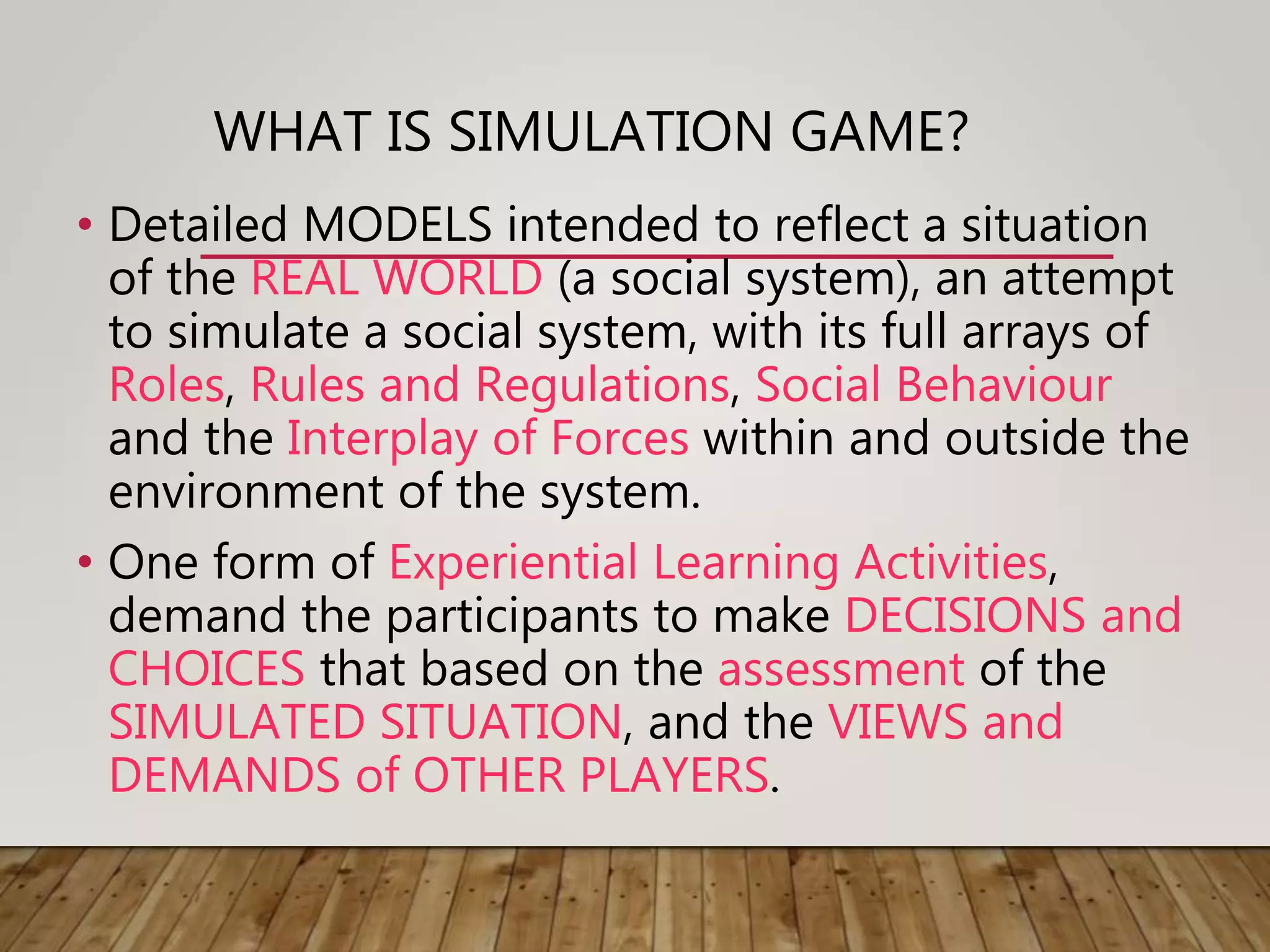 Simulation games are detailed models that simulate real-world social systems and the roles, rules, behaviors, and forces within them. They are a form of experiential learning where participants make decisions and choices based on the simulated situation and demands of other players. Simulation games model social systems through elements like people, goals, structure, and resources. The process of facilitating a simulation game involves preparation, running the activity phase where participants are assigned roles and learn the rules, and a post-activity phase for discussion and debriefing. While simulation games can effectively teach social concepts, they also run the risk of oversimplifying systems or focusing too much on competition over learning.