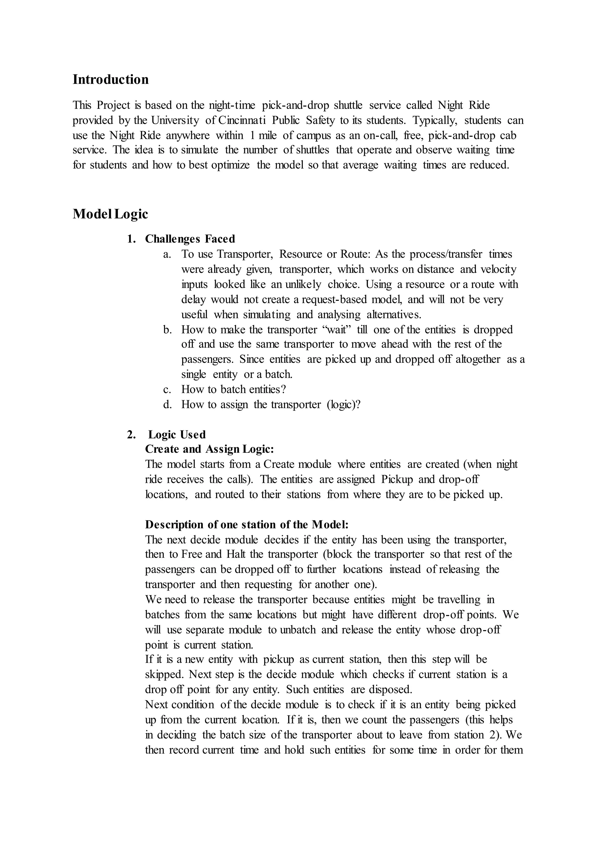 This document presents a simulation modeling project for the University of Cincinnati's night ride shuttle service, focusing on optimizing shuttle assignment to reduce wait times for students. Key elements include the model's logic, challenges faced, data collection, and distribution fitting, leading to a conclusion that assigning shuttles based on proximity rather than a cyclical system is the most effective strategy. The simulation evidences that this approach significantly improves average times in the system, despite slightly increasing maximum waiting times.
