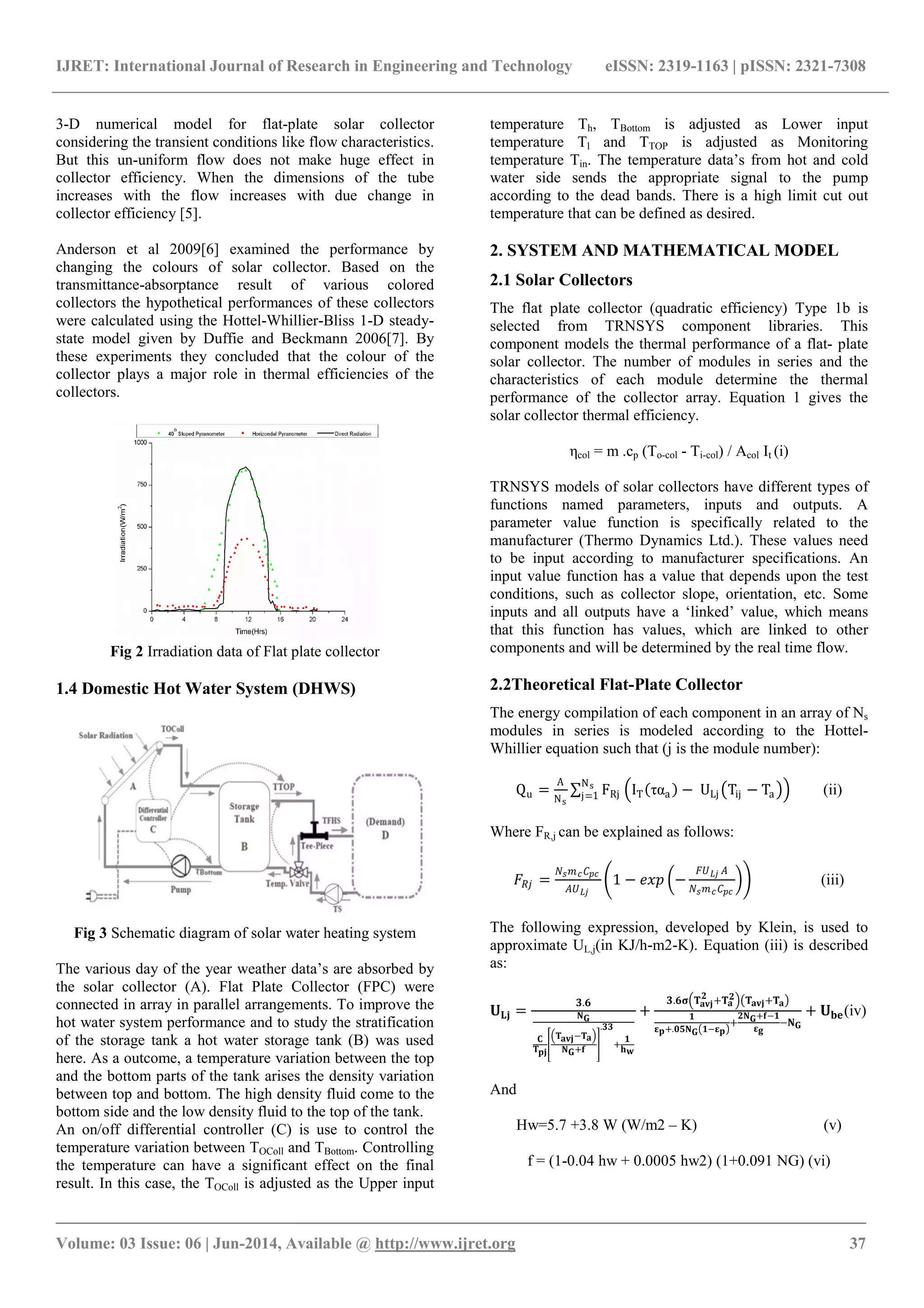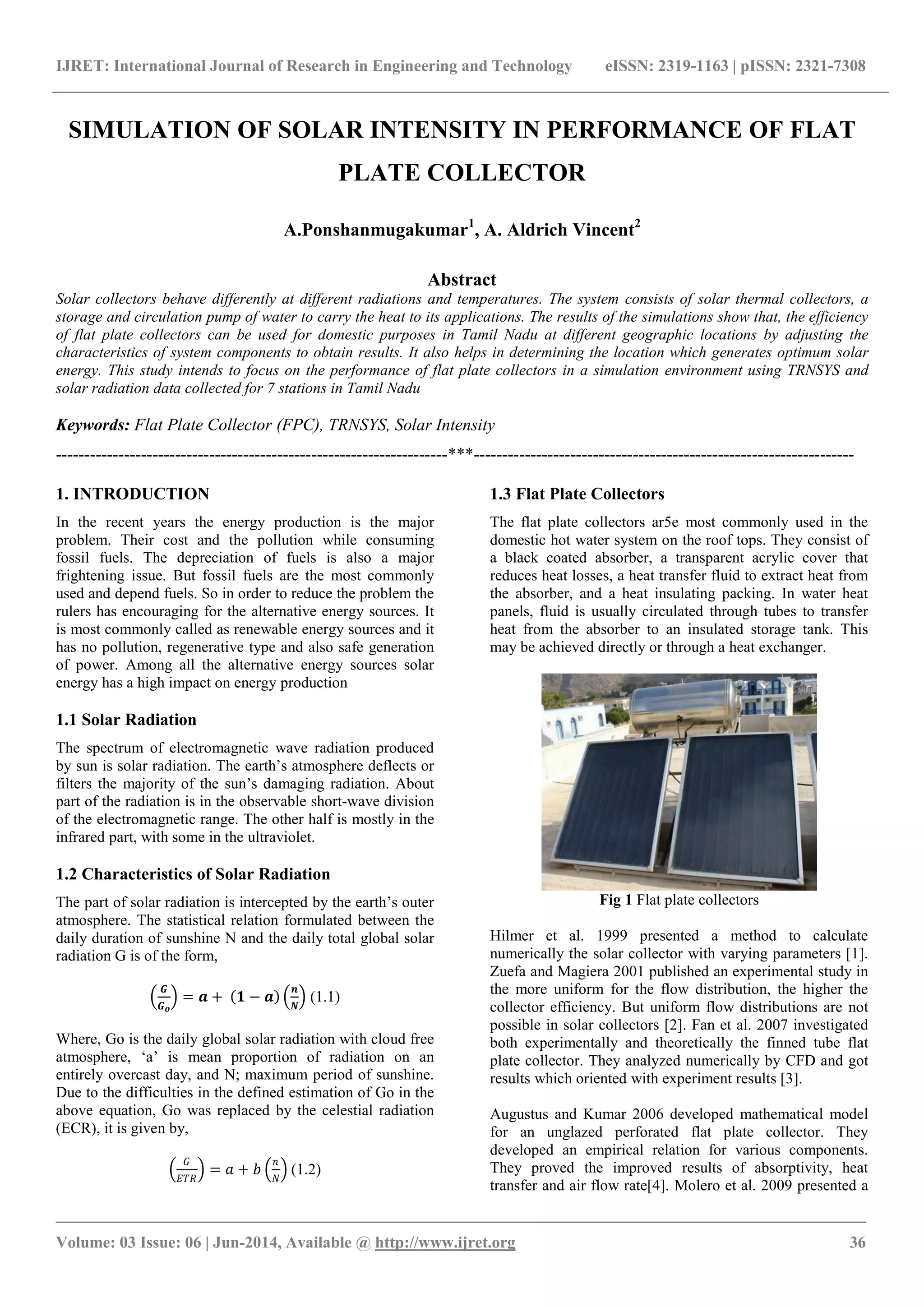 The document discusses the simulation of solar intensity and the performance of flat plate collectors in Tamil Nadu, focusing on the use of TRNSYS software for modeling. It provides insights into the efficiency of solar collectors at different geographic locations and emphasizes the importance of solar energy as a renewable resource. The study concludes that areas like Erode exhibit optimal output performance for domestic energy needs through solar energy utilization.