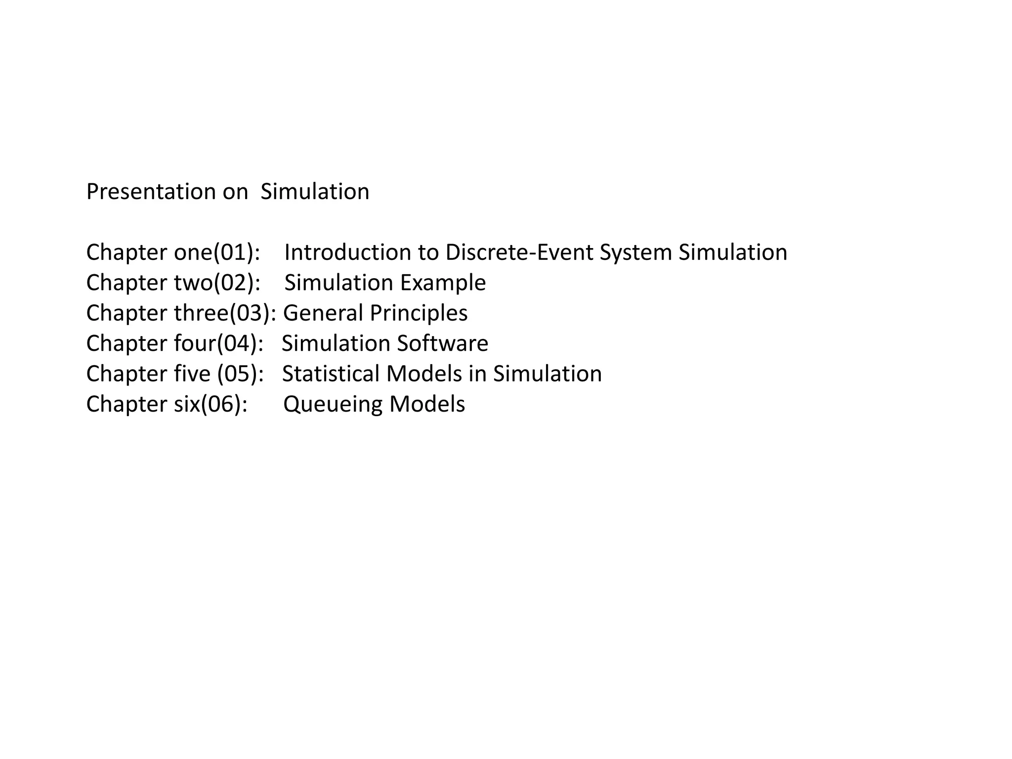 This document summarizes the chapters of a presentation on simulation. It includes: