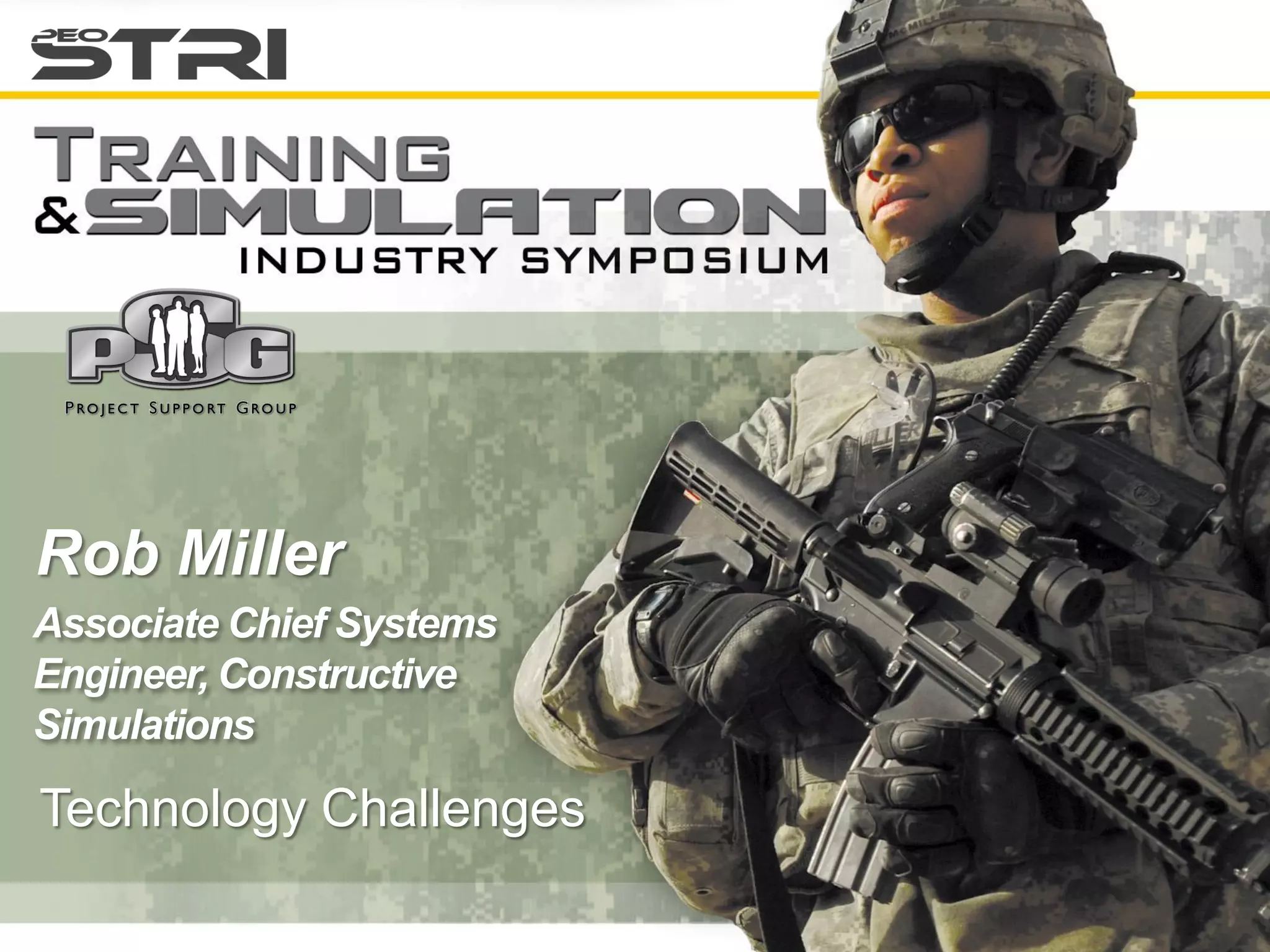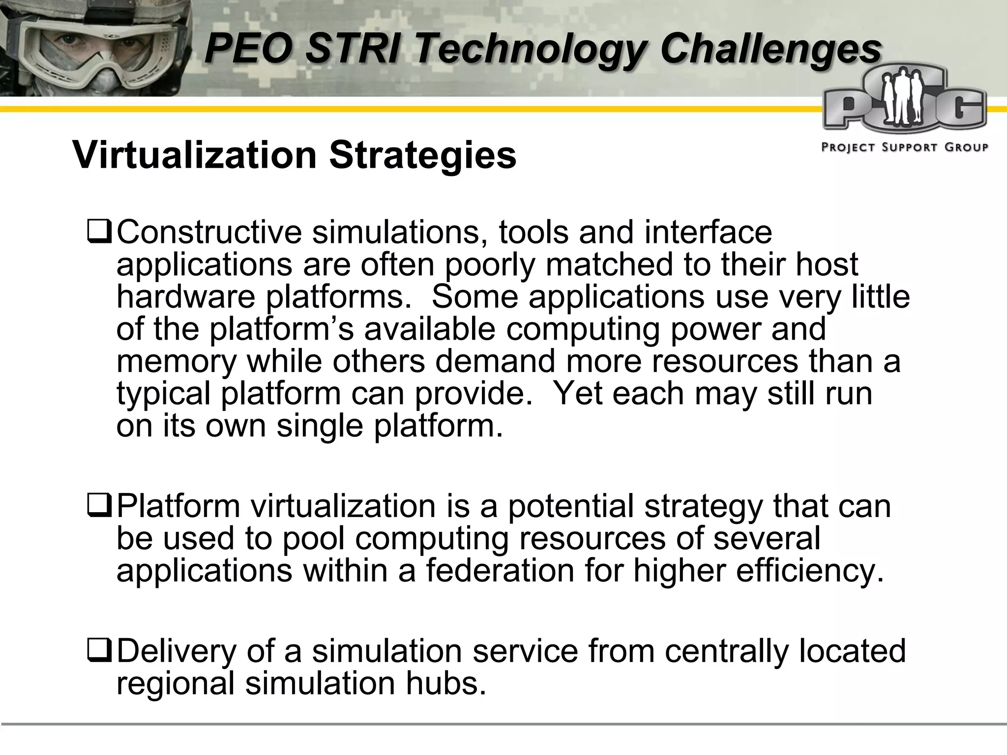 The document outlines several technology challenges for the Program Executive Office for Simulation, Training and Instrumentation (PEO STRI) including: