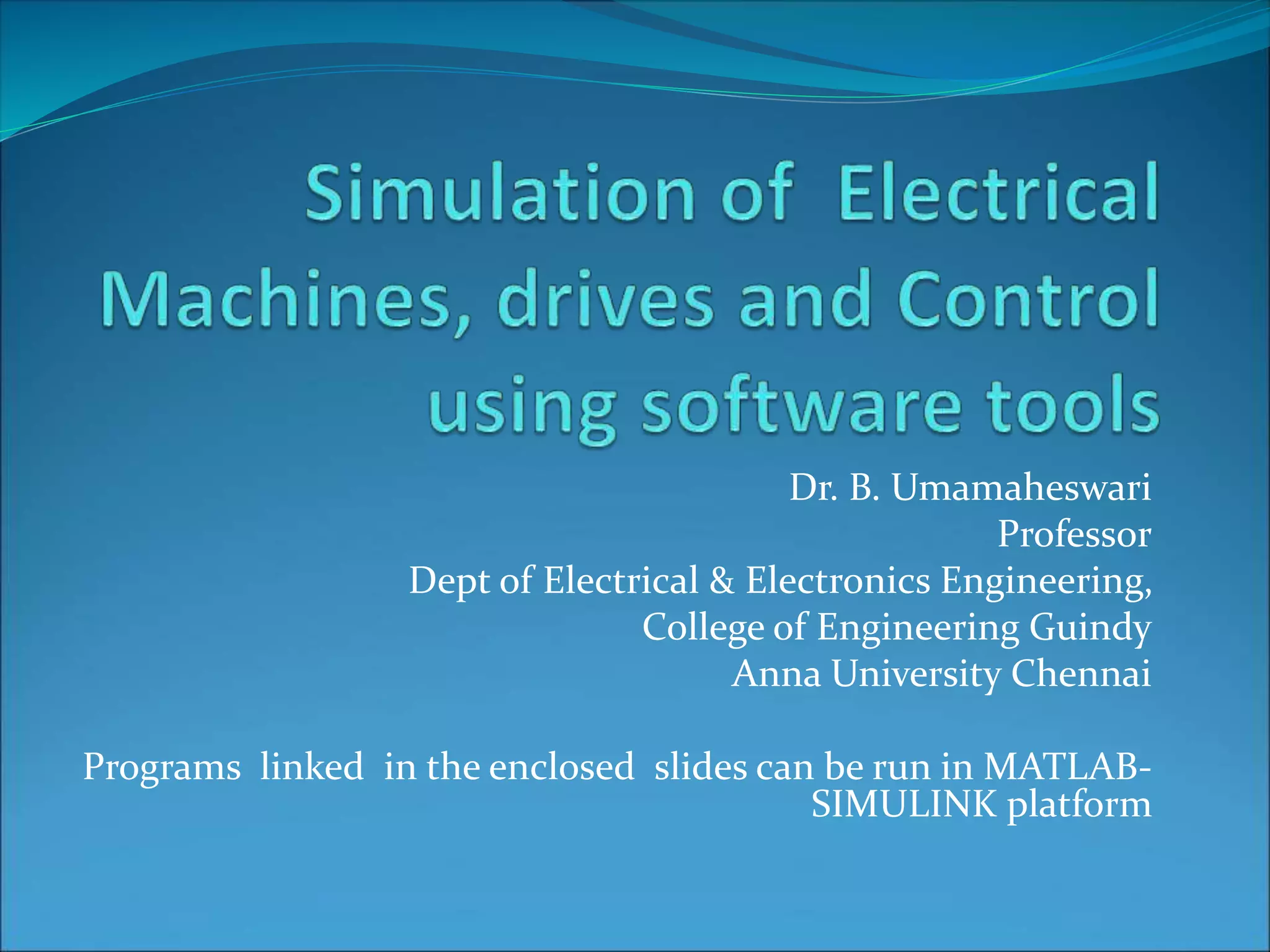 Dr. B. Umamaheswari gives a presentation on using MATLAB and SIMULINK software tools to teach concepts in electrical machines, drives, and control. She discusses 5 topics - electro-magnetics, electro-mechanics, DC machines, induction machines, and references. For each topic, she presents the relevant theory, MATLAB models, codes, and simulations that can help explain the concepts and characterize machine performance under different operating conditions. The goal is to provide students a better understanding and hands-on learning experience with electrical engineering domains.