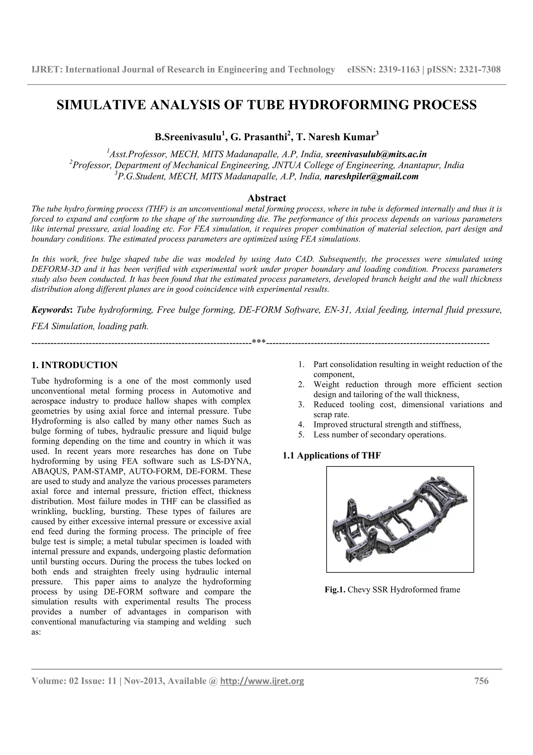 This document presents research on tube hydroforming (THF), an unconventional metal forming process that utilizes internal pressure and axial loading to shape tubes into complex geometries. Using finite element analysis (FEA) simulations with Deform-3D software, the study optimizes process parameters and compares the results with experimental data, demonstrating that the simulation yields results closely aligned with experimental outcomes. The research highlights the advantages of THF, including part consolidation, improved structural strength, and reduced tooling costs.