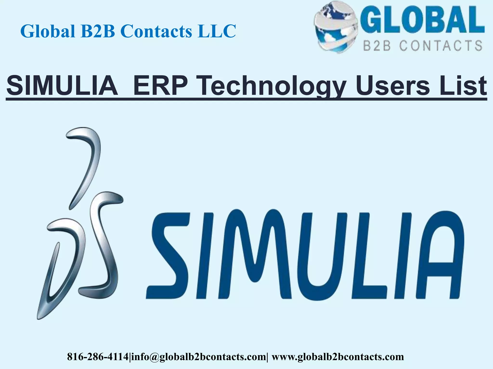 Global B2B Contacts LLC provides an extensive mailing list specifically for Simulia ERP technology users, aiming to enhance marketing campaigns through a well-segmented database of potential decision-makers. The company emphasizes high response rates and return on investment by supplying comprehensive, accurate, and targeted data gathered from various reputable sources. Their services include email appending, free consultations, and guarantees on data accuracy and delivery.