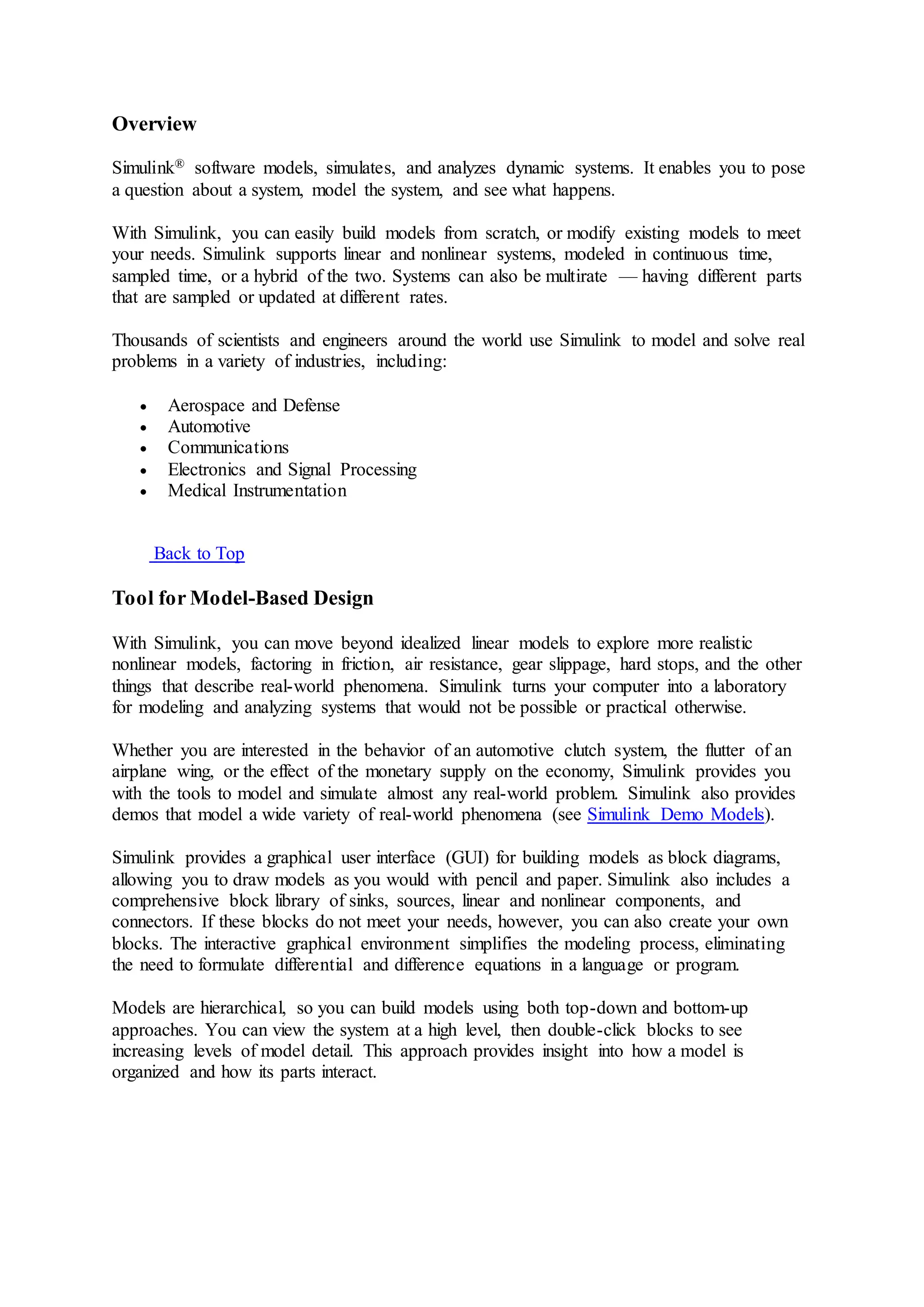 Simulink software allows users to model, simulate, and analyze dynamic systems. It provides a graphical interface for building models as block diagrams using premade blocks or custom blocks. Models can represent systems from various industries and can be linear or nonlinear, continuous or discrete. Simulink is integrated with MATLAB, allowing users to define inputs, store outputs, and perform analyses.