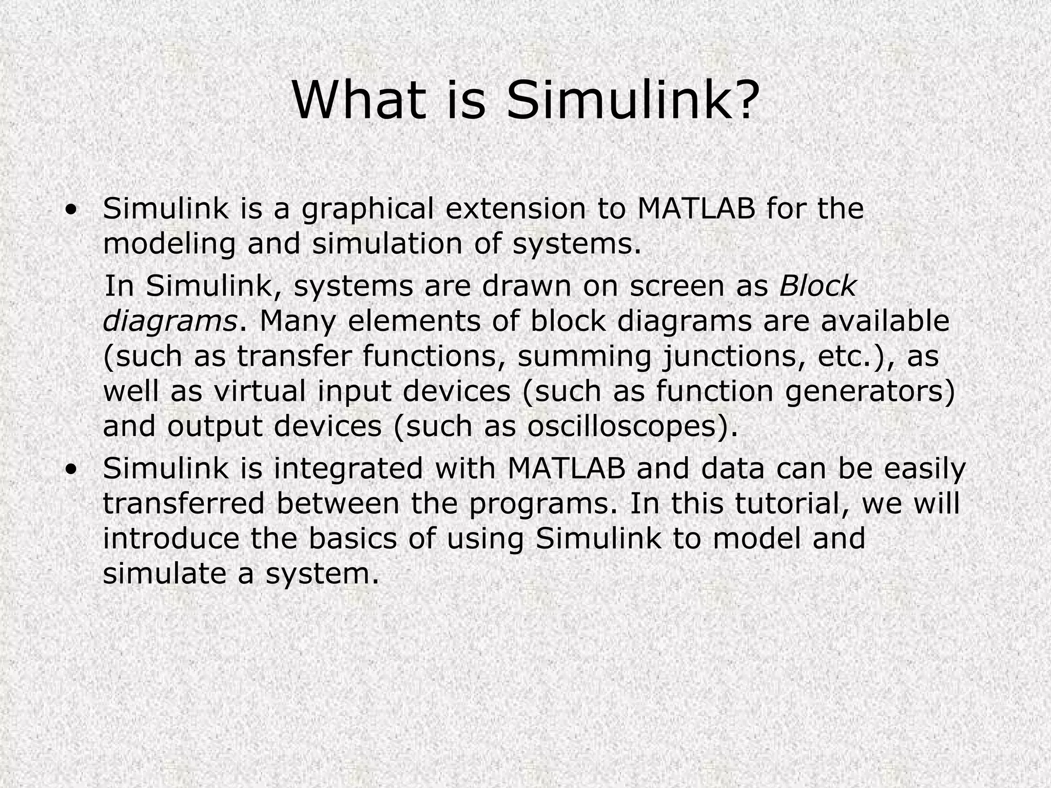 Simulink is a graphical extension of MATLAB used to model and simulate systems using block diagrams. It contains various block types like sources, sinks, math operations, and more that can be connected with lines to represent the system. The tutorial introduces starting Simulink, basic block and line elements, and demonstrates modeling a simple system with a sine wave source, gain block, and scope sink to view the output over time.