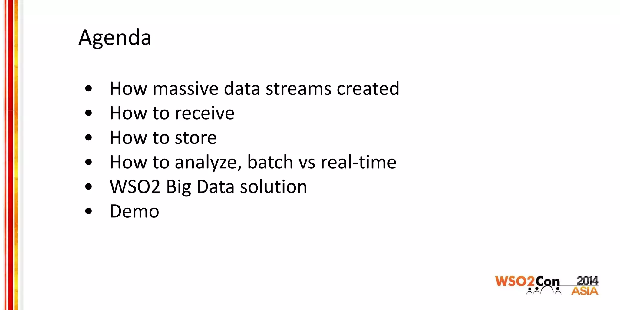 This document discusses analyzing massive data streams in real-time and batch processing. It describes how data streams are created from sources like machine logs and sensors. The data can be stored in databases or data stores like HDFS. The data can then be analyzed through either batch processing using Hadoop/Hive or real-time processing using Storm/CEP engines like WSO2 Siddhi. The document presents WSO2's big data architecture for receiving and analyzing the same data streams in both batch using BAM and real-time using CEP.