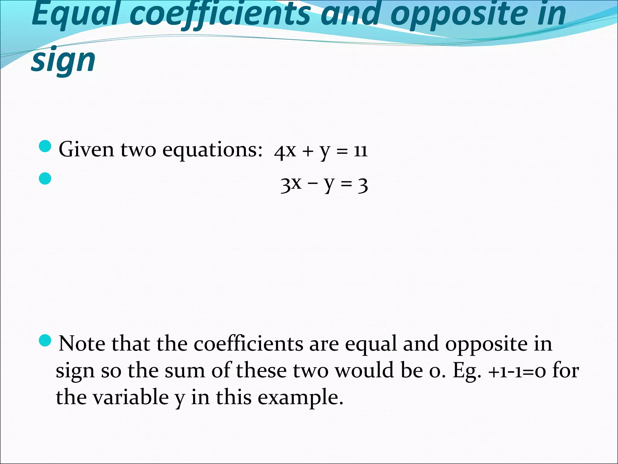 The document describes the elimination method for solving simultaneous linear equations. It involves: 1) Identifying equations where one variable has equal and opposite coefficients; 2) Adding the equations to eliminate this variable; 3) Solving the resulting equation for the remaining variable; and 4) Substituting back into one of the original equations to solve for the eliminated variable. As an example, it shows using this method to solve the equations 4x + y = 11 and 3x - y = 3 for x = 2 and y = 3.