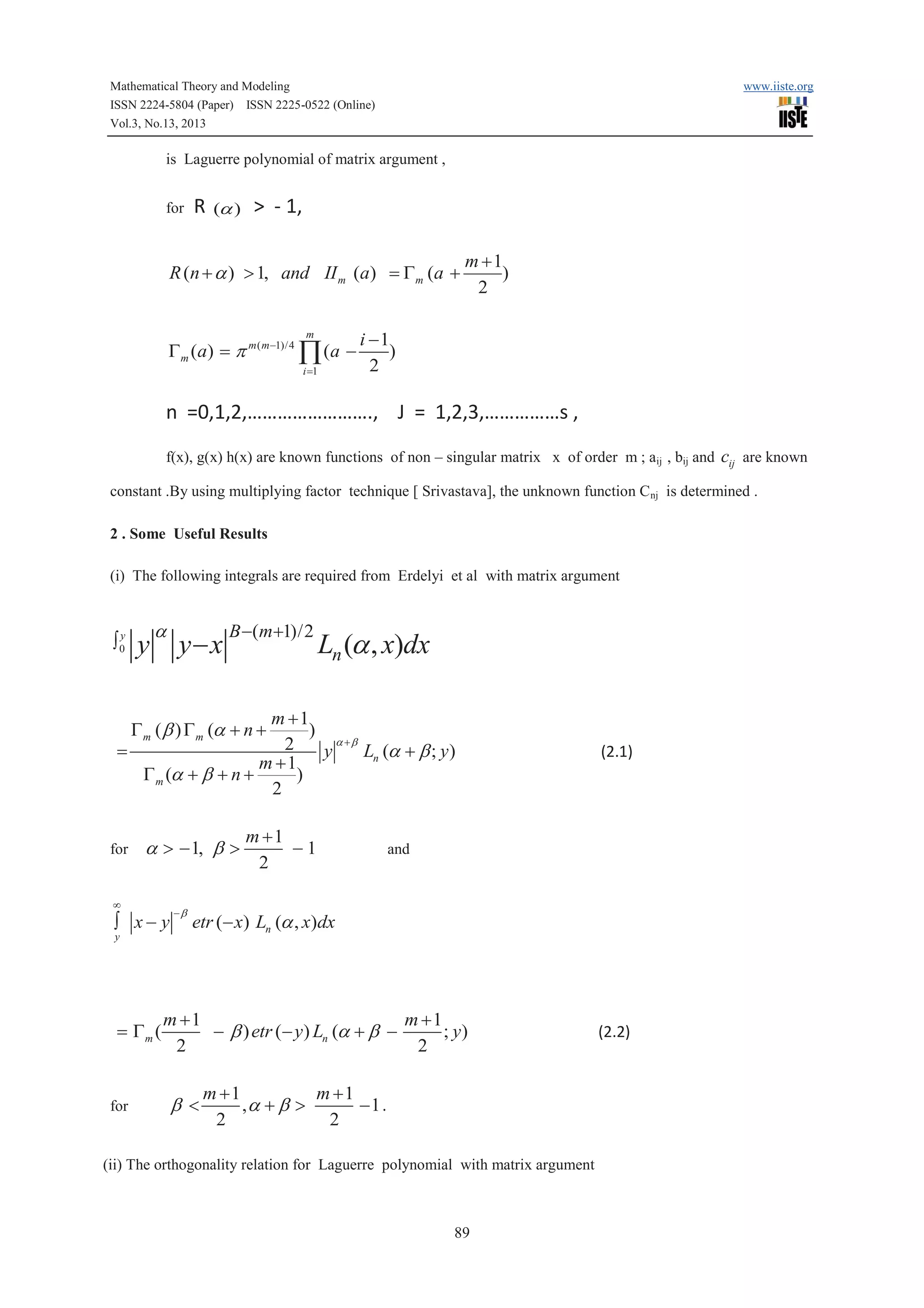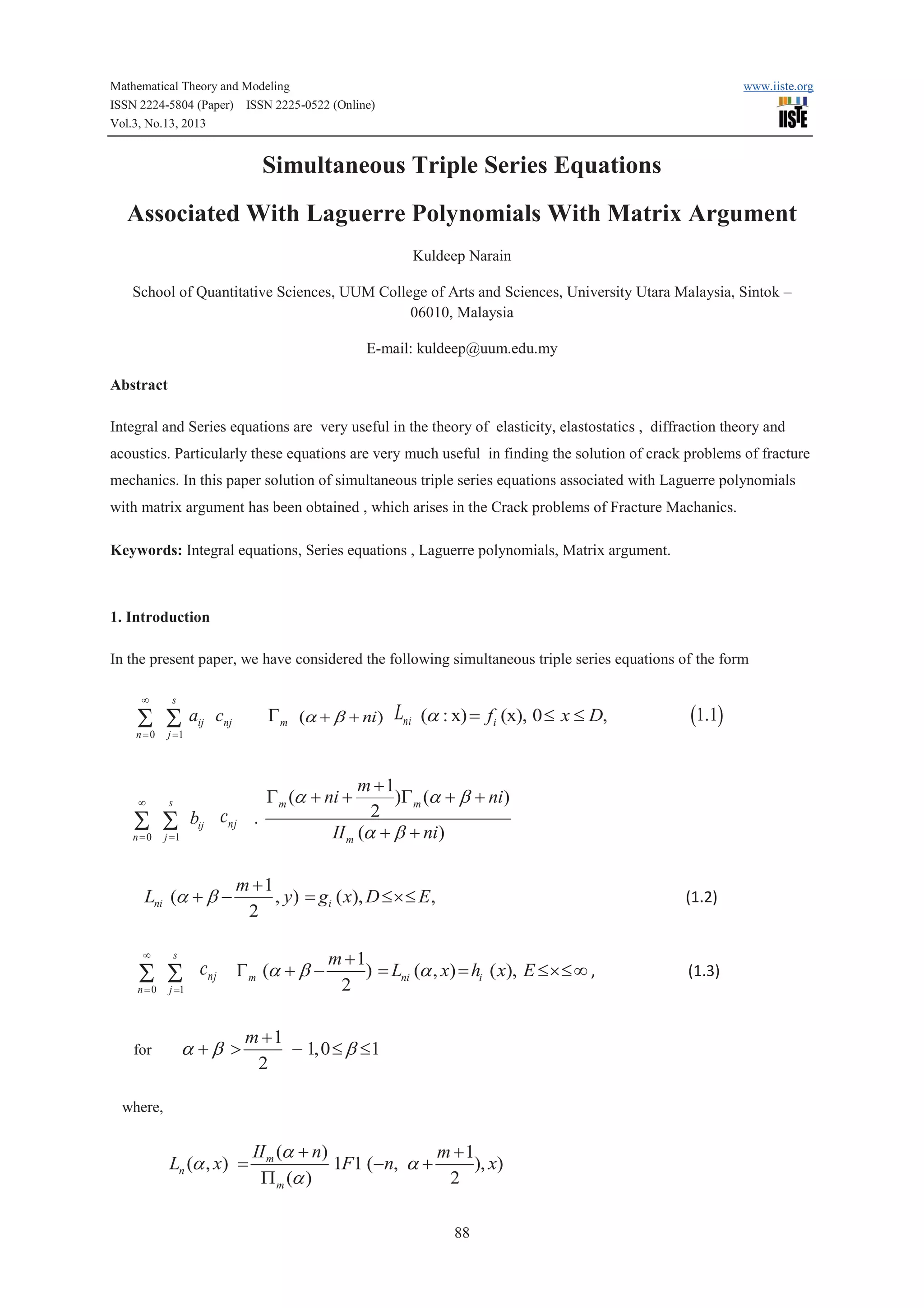 This academic article discusses solving simultaneous triple series equations associated with Laguerre polynomials with matrix arguments. It presents the following simultaneous triple series equations that arise in crack problems in fracture mechanics. It then provides solutions for the unknown function Cnj by using integral equations, orthogonality relations of Laguerre polynomials, and differential formulas. The solutions are determined for specific conditions on the parameters a, b, and m.