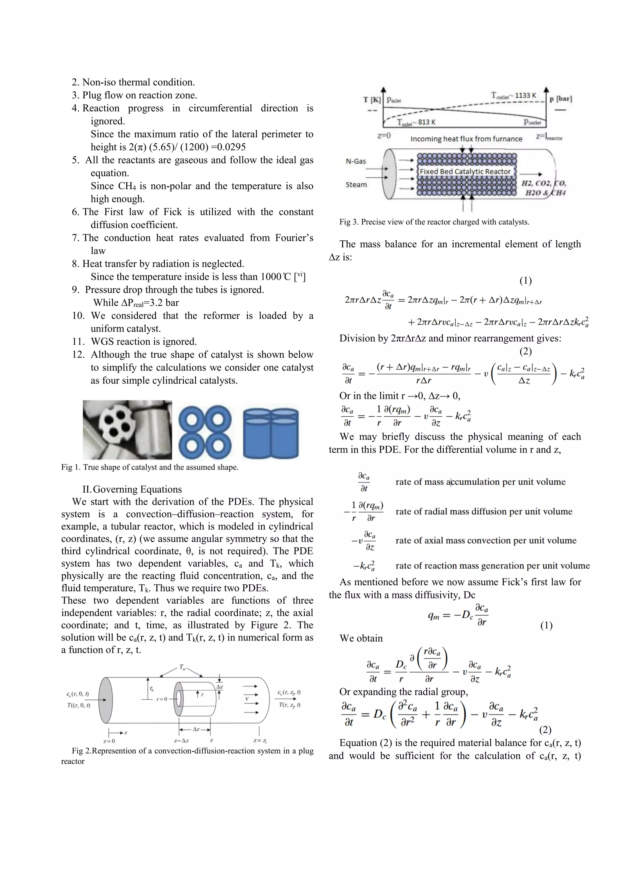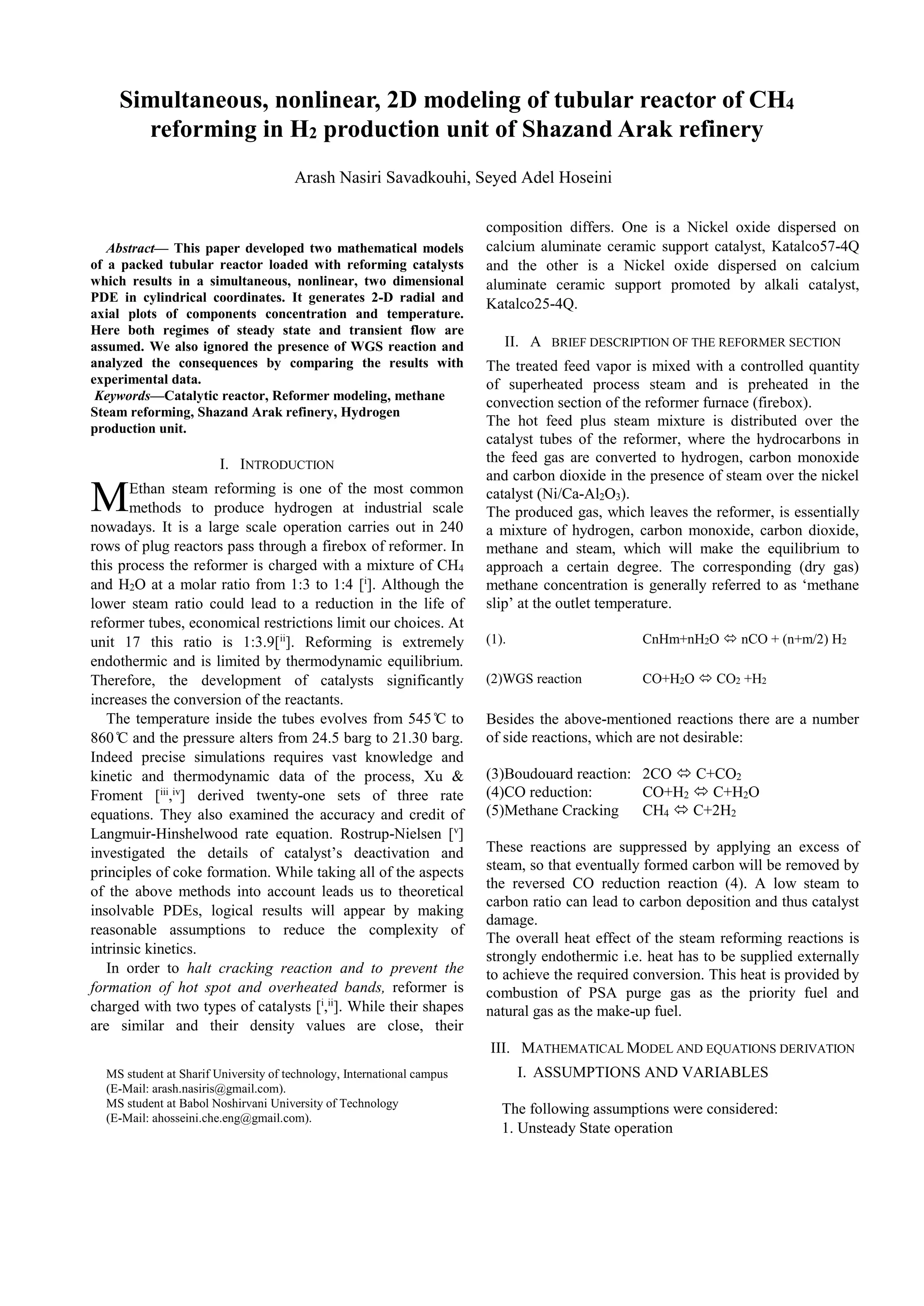 This paper develops two mathematical models of a packed tubular reactor for methane steam reforming to produce hydrogen. The models generate 2D radial and axial plots of component concentrations and temperature over time. Both steady state and transient flow regimes are considered. The models consist of two coupled partial differential equations, one for material balance and one for energy balance, with initial and boundary conditions. The equations include terms for convection, diffusion, reaction, and heat transfer. Simplifying assumptions are made to reduce complexity, such as ignoring pressure drop and the water-gas shift reaction.