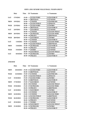 The document contains details of the SIMVA 2011 Senior Volleyball Tournament including dates, times, matchups and results for 20 matches in the first round and 40 matches in the second round played between teams including GUESS WHO, GO FOR IT, REPTILES, UNITED, SUPER SIX, POLICE, GUESS WHAT and NITRO. It also includes a table summarizing the results with the teams ranked by number of matches won, sets won, points scored and points against to determine their overall placement.