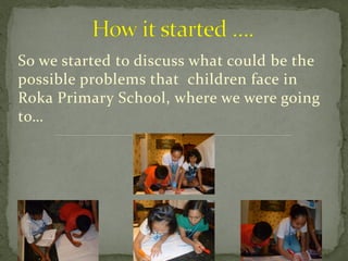 A group of students from Singapore participated in a community involvement program in Cambodia from June 3-7, 2011. They visited Roka Primary School to research issues facing the students. They learned that the village was one of the oldest in the area, but the province had high poverty and illiteracy rates. The students also found that the children could not afford basic hygiene items. So the group focused on teaching hygiene and distributed donated toothbrushes, soap, and other supplies. While communication was challenging due to language barriers, the students were happy to see the Cambodian pupils smiling at the end of the day.