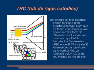 TRC (tub derajos catódics) Son encara les més baratas i poden tenir una gran qualitat d'imatge. Com que no tenen una resolució fixa, poden mostrar fonts de diferentes resolucions amb una bona qualitat. La frecuència d' un televisor NTSC es de 29.97 Hz, y de 25 Hz en el cas de televisores de la normal PAL. La resolució dels NTSC es de 480 líneas, i els PAL de 575.