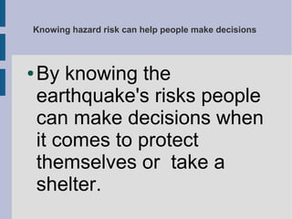 Science helps predict natural hazards like earthquakes by studying tectonic plate movement to determine areas of high seismic risk. Monitoring systems like SCIGN use GPS to track plate movement and help prevent earthquakes. Knowing the risk of hazards allows people to make decisions to protect themselves, such as taking shelter, while human development in hazardous areas can turn disasters into greater catastrophes if buildings are not constructed to withstand hazards. Preparing infrastructure and emergency responses can minimize the consequences of hazards when they do occur.