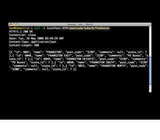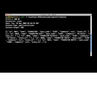 This document discusses Sinatra, a Ruby web application framework built with Rack middleware. It provides examples of basic Sinatra applications and routes, and discusses how Sinatra apps can also be used as Rack middleware. It promotes some projects by the author including Amnesia for Memcached stats, Munch for recipe search, and Postie for postcode services implemented as Rack middleware. It also discusses related tools like Shotgun for reloading and Rack middleware like Rack::Cache.