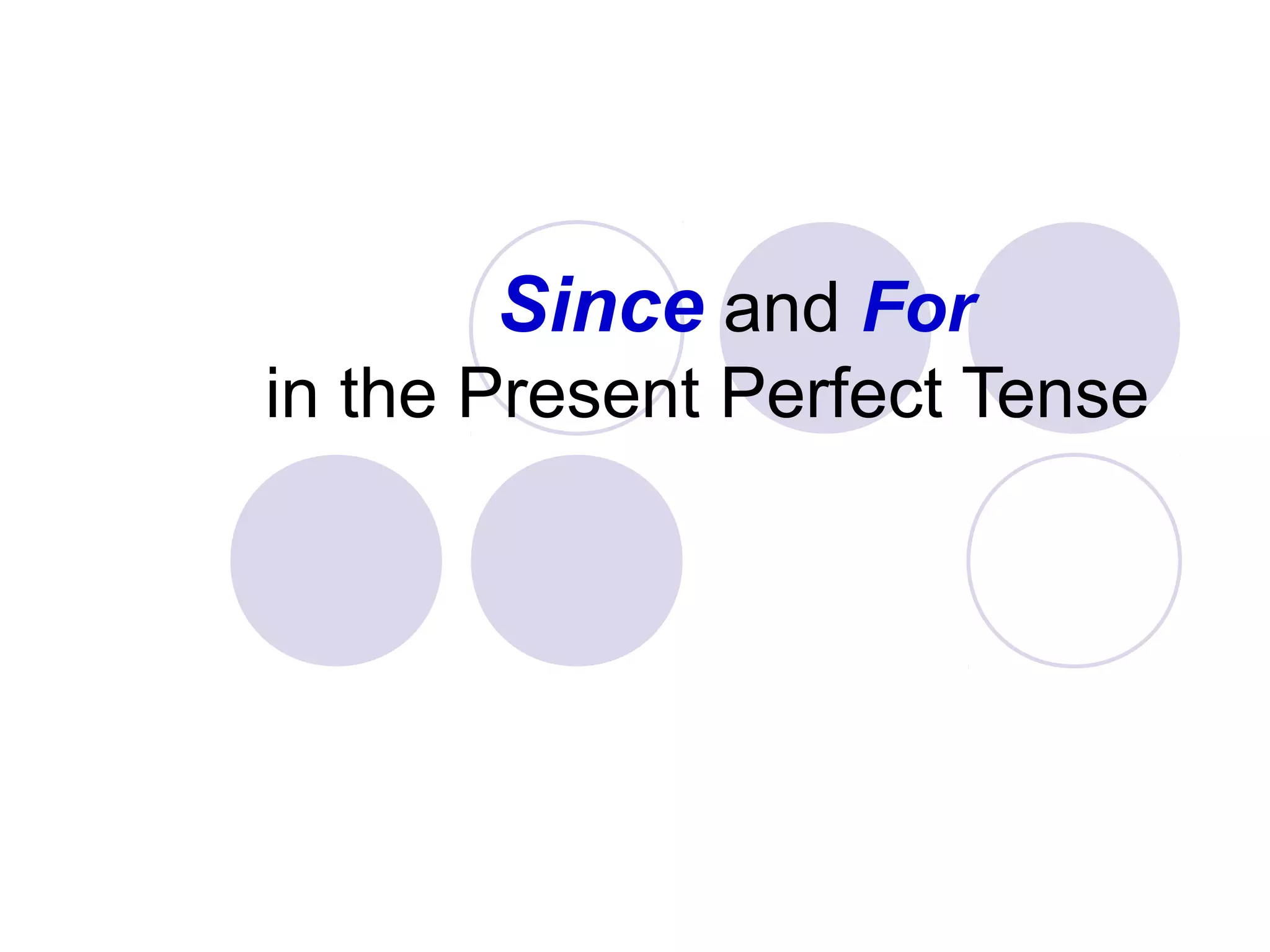 The document discusses the use of "since" and "for" in the present perfect tense. Since is used to indicate a starting point in time, such as "since Monday" or "since 2006." For is used to indicate a period or duration of time, like "for two weeks" or "for a decade." Several example sentences are provided that use since and for in the present perfect tense to express when an action began or how long it has been occurring.