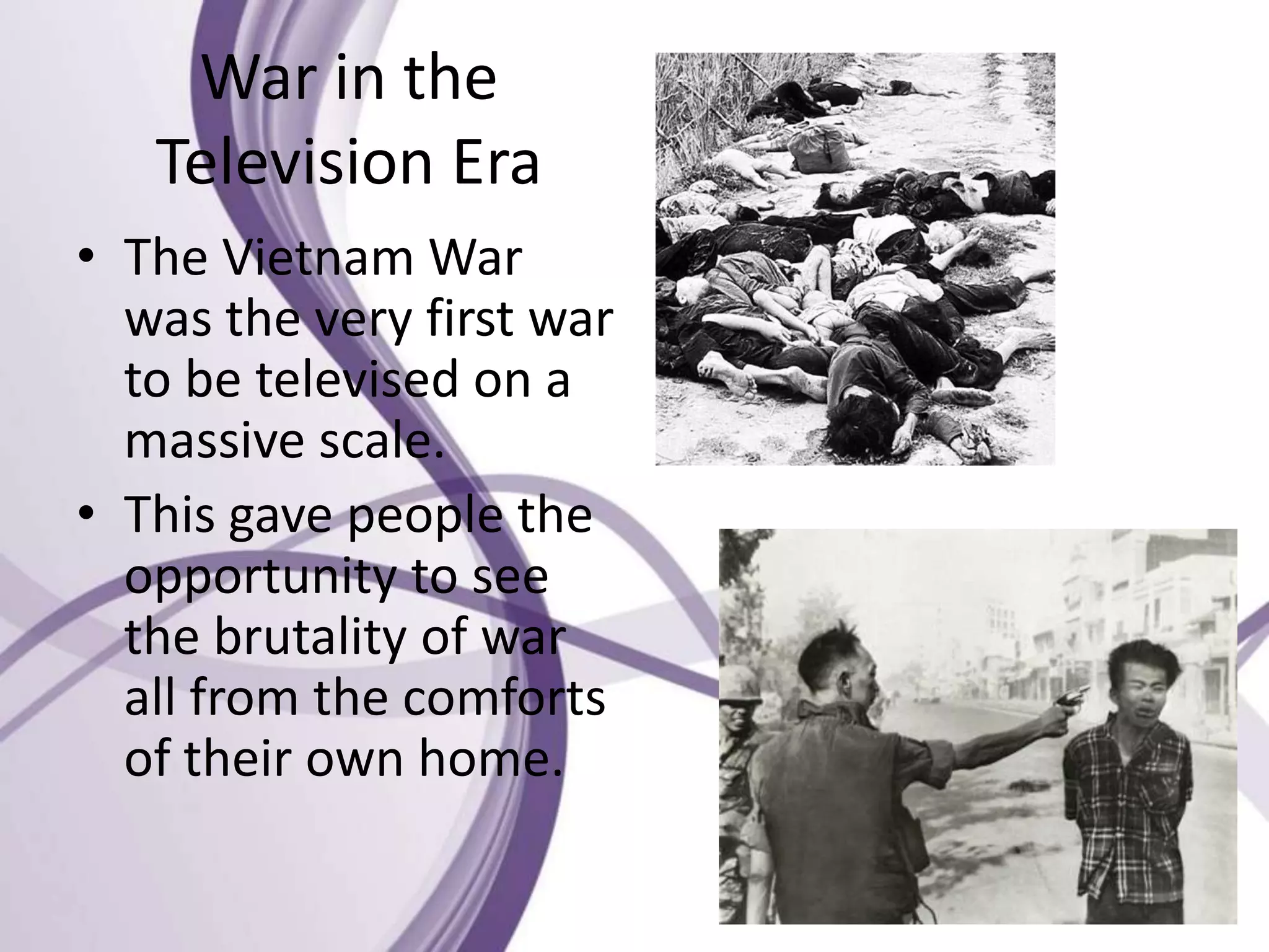 The Vietnam Peace Movement document summarizes the impact of televised coverage of the Vietnam War and the resulting peace movement in the United States. Television allowed people to witness the brutality of war from home, fueling public backlash against the war and the formation of the hippie counterculture movement. Growing unrest led the U.S. to withdraw all troops from Vietnam by 1975, making it the first American war to face such large-scale domestic opposition. Public opinion polls from 1965 to 1971 show declining support for U.S. involvement in the war over that period.