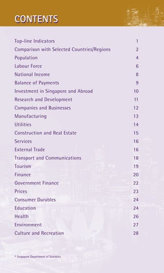 1. The document provides statistics on various indicators for Singapore such as population, labour force, national income, trade, and social factors for years 2010 and 2011.
