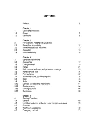 The chapter outlines the provisions for accessibility for persons with disabilities in various types of buildings. It specifies that the communal areas and facilities of residential buildings of 4 storeys and below (with or without lift access), and all areas of residential buildings of 5 storeys and above must be accessible. It also lists other types of buildings such as offices, shopping complexes, hotels, places of public resort, parks, schools and restaurants where all areas intended for access by employees or the public must be accessible. The aim is to set requirements to make key areas of these buildings accessible to persons with disabilities according to this Code.