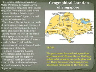 Singapore is located between Malaysia and Indonesia, covering an area of 699 square kilometers. It has a tropical climate with hot and humid weather year-round, averaging 27 degrees Celsius, with high rainfall and humidity. Singapore's nature reserves like Bukit Timah and Central Catchment house over 500 animal species and 800 plant species, though tropical rainforests have decreased due to urbanization. The government strongly protects remaining natural resources and biodiversity.