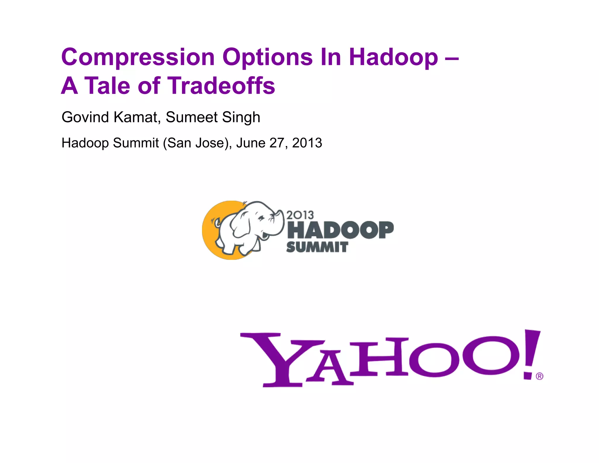 The document discusses various data compression options in Hadoop, emphasizing the trade-offs between compression speed, CPU utilization, and overall performance for data-intensive MapReduce jobs. It outlines the different compression algorithms available, such as zlib, bzip2, lzo, lz4, and snappy, along with their characteristics and use cases within the Hadoop ecosystem. Additionally, the document addresses the current usage and performance evaluations of these codecs at Yahoo!, highlighting the importance of selecting the right compression technique based on specific data and project needs.
