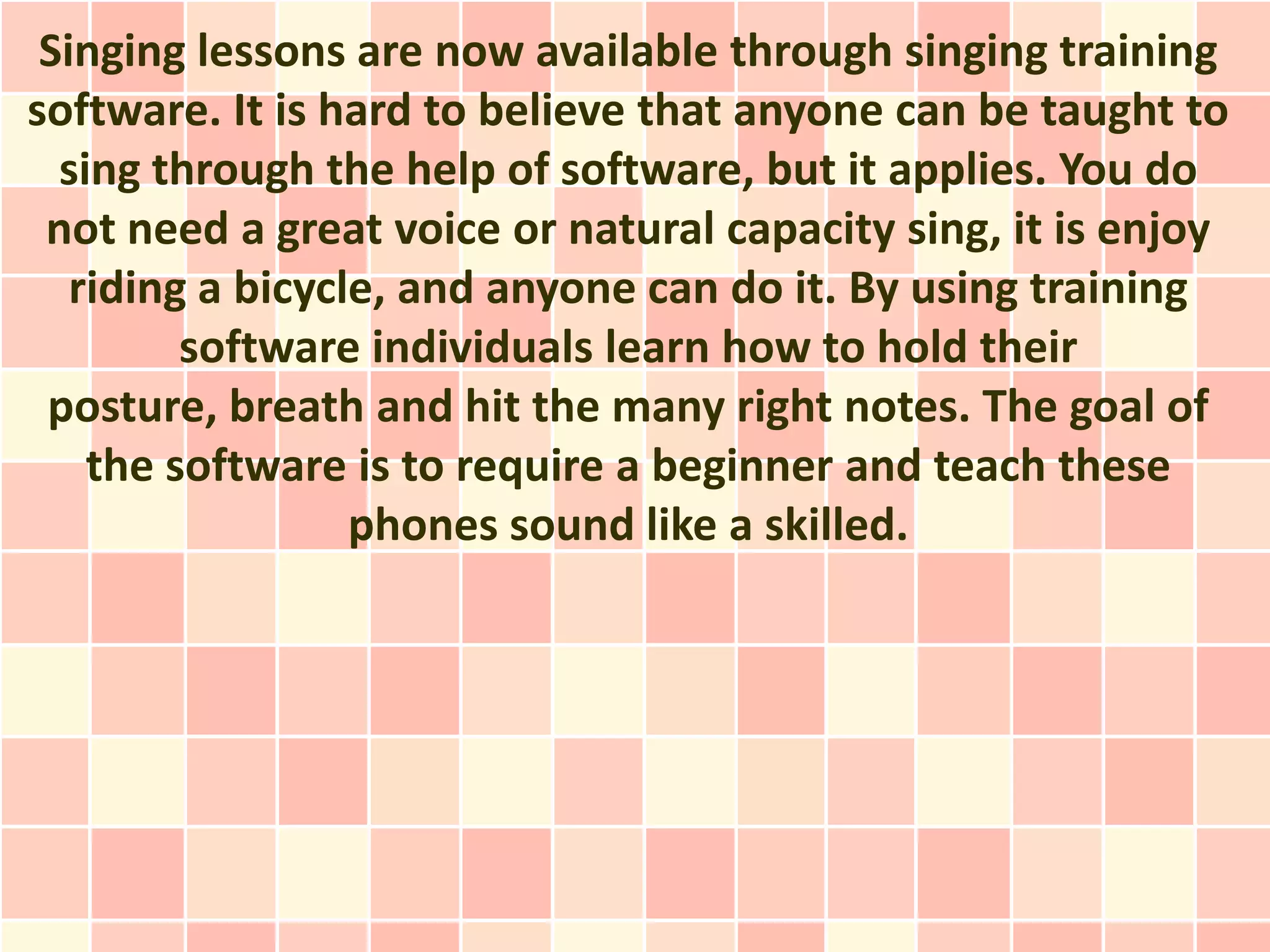 Singing training software provides lessons to teach proper singing techniques without an in-person instructor. It allows users to learn posture, breathing, pitch, and other skills through vocal exercises. The software provides feedback to help users identify areas to improve. While talent helps, determination and practice are more important for becoming a better singer. Singing scales, learning proper breathing, and understanding vocal range are some key exercises the software can help teach.
